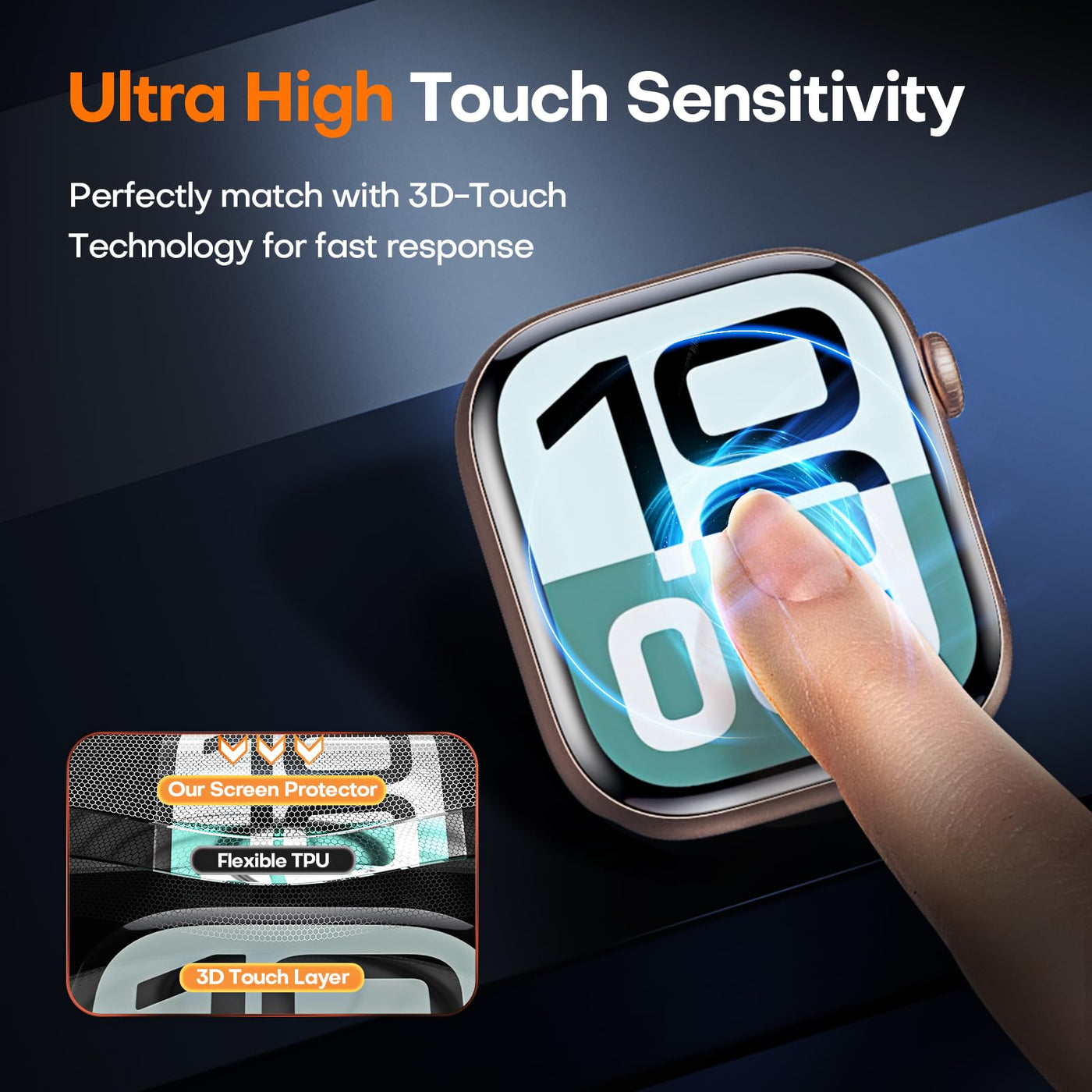 Q: Will the screen protector affect the touch sensitivity of my Apple Watch?A: No, the TOCOL screen protector is designed with cutting-edge technology to maintain the touch sensitivity of your Apple Watch, providing a smooth experience that feels like using a naked screen.