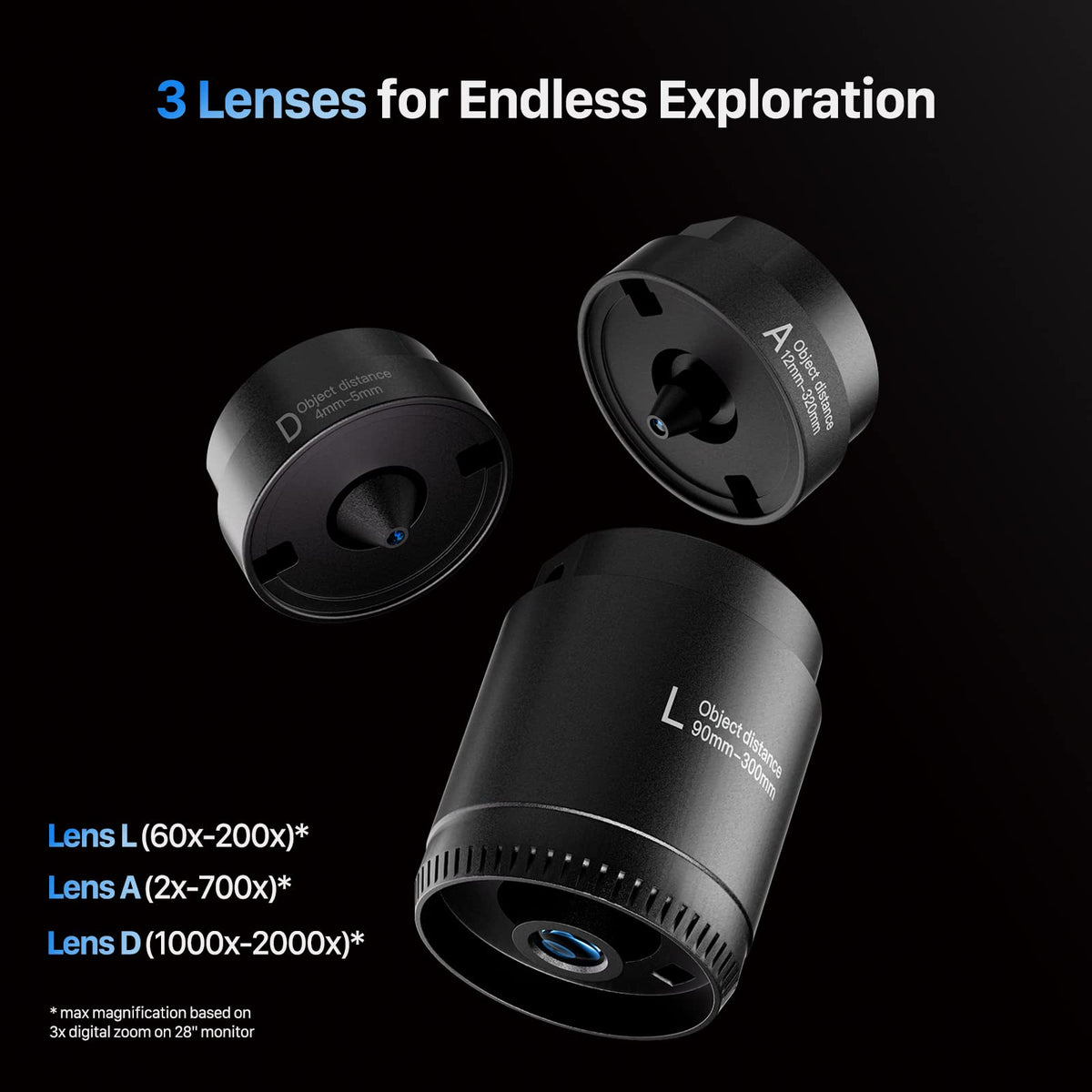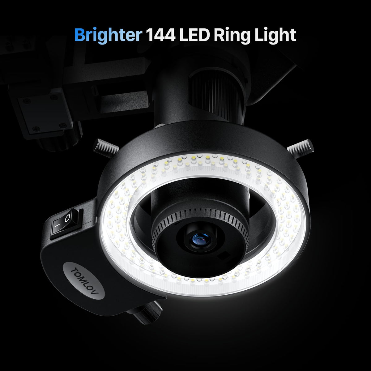 Q: What are the main features of the TOMLOV DM602 Pro digital microscope?A: The TOMLOV DM602 Pro features a 10.1-inch IPS screen, 2000x magnification, a 144-LED ring light for exceptional illumination, an upgraded boom arm stand for flexibility, and three interchangeable lenses for various applications.