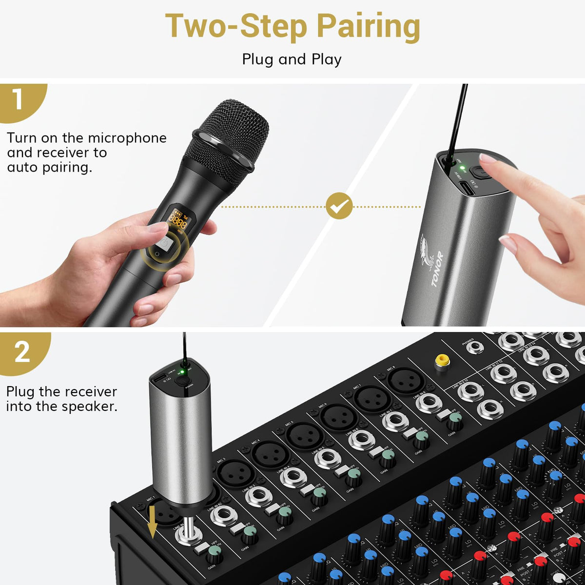 Tonor Wireless Microphone, Uhf Dual Cordless Metal Dynamic Mic System With Rechargeable Receiver, For Karaoke Singing, Wedding,