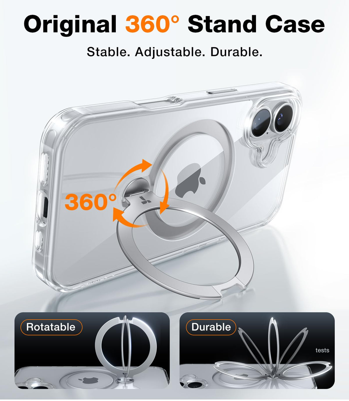 Q: What is the main feature of the TORRAS 360° Spin Stand for iPhone 16 Plus?A: The main feature of the TORRAS 360° Spin Stand is its pioneering 360° adjustable kickstand, which allows you to position your iPhone 16 Plus in various angles for optimal viewing, whether in landscape or portrait mode.