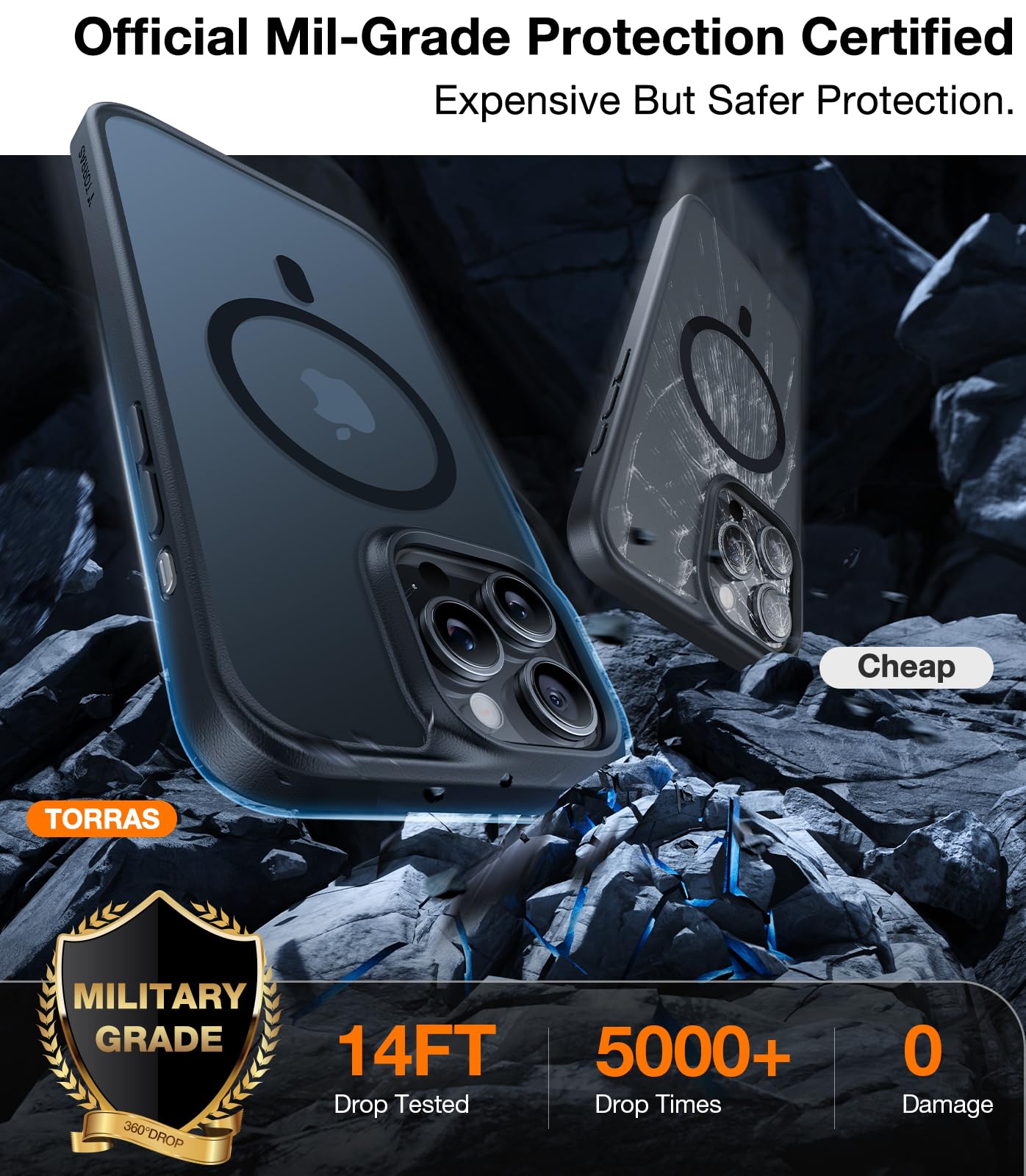 Q: What kind of protection does the TORRAS case offer?A: The TORRAS case provides military-grade protection with features like 1.2mm raised screen lips, 0.8mm lifted camera bezels, and 16 groups of protective cushions. It effectively protects your iPhone 15 Pro Max from drops, collisions, and shocks.