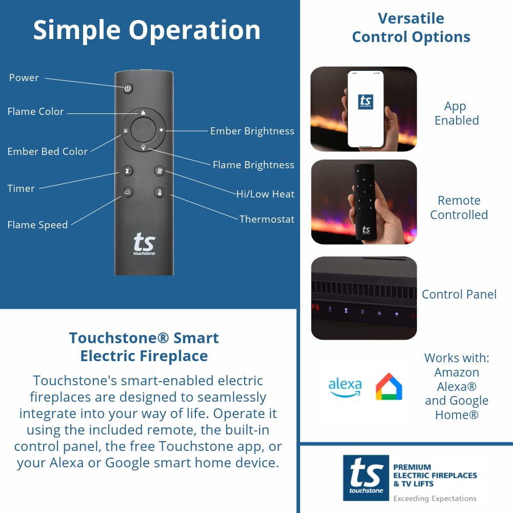 Q: Can I control the flame settings remotely?A: Yes, the Touchstone Sideline Infinity is Wi-Fi enabled and can be controlled through a smartphone app. You can also use the included remote or touchscreen to adjust the flame color, brightness, speed, and heat settings.