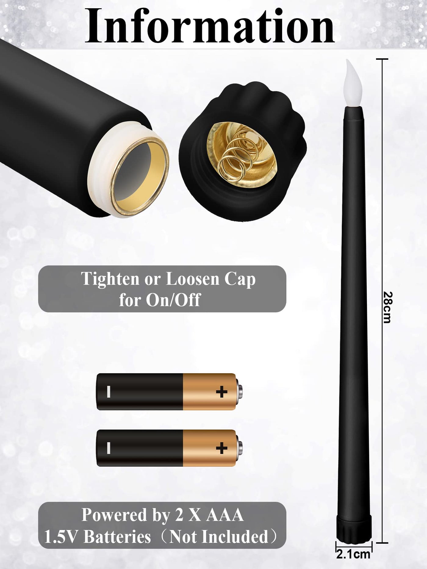 Q: How long do the batteries last in these LED taper candles?A: The battery-operated LED taper candles require 2 AAA batteries each (not included). The battery life can vary based on usage, but generally, they last for several hours, making them ideal for extended events.