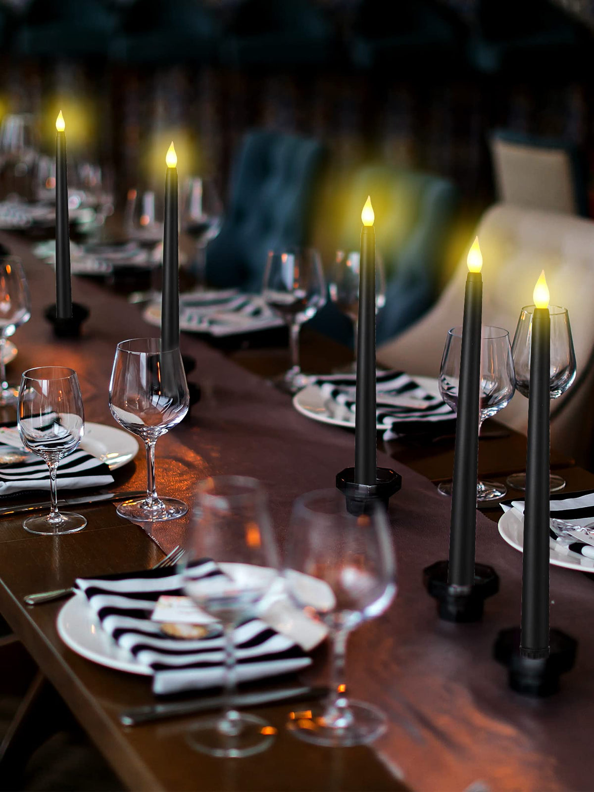 Q: Can these taper candles be used in standard candlestick holders?A: Yes, each flameless taper candle measures 0.8 x 11 inches, making them compatible with all standard and glass taper candlestick holders.