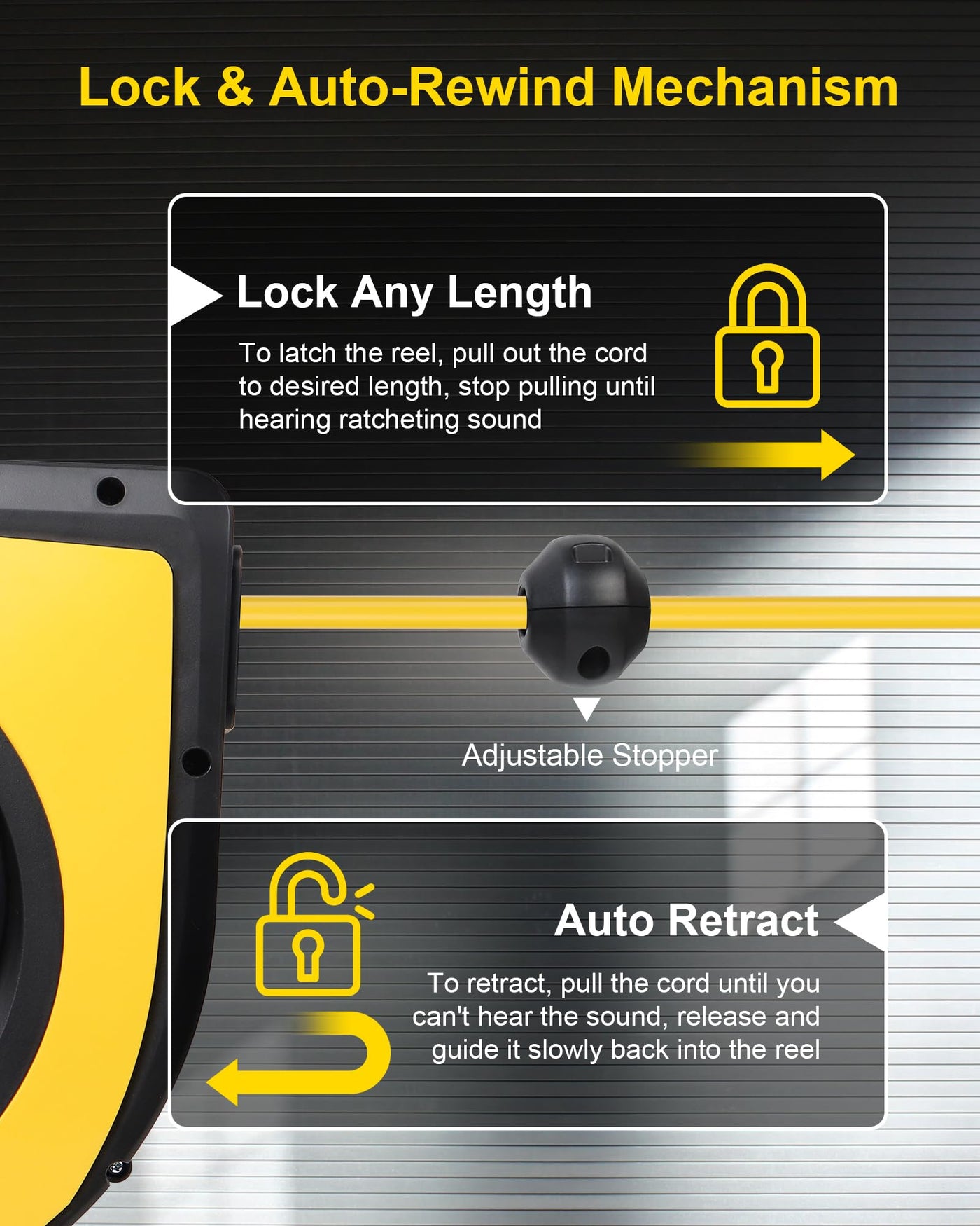 Q: How does the automatic retractable feature work?A: The automatic retractable feature of the TREEWELL Extension Cord Reel allows the cord to be easily pulled out to the desired length and locks in place. When not in use, it retracts smoothly and quickly, minimizing tangling and keeping your workspace organized.