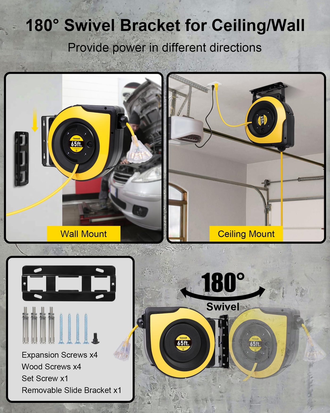 Introducing The Treewell 65 Ft Retractable Extension Cord Reel - A Must-Have For Any Garage Or Shop. This Ul Listed Cord Reel Comes With A Range Of Impressive Features That Make It A Handy Addition To Your Workspace.Firstly, It Is Solidly Constructed With A Hard-Impact Polypropylene Housing, Ensuring Durability And Longevity. The 65 Ft Retractable Cord, Combined With The 4.5 Ft Lead-In Cord With A Lighted Triple Tap, Provides Ample Reach For Your Power Needs.Say Goodbye To Tangled Cords And Manual Winding With The Automatic Retractable Feature. This Clever Mechanism Locks At The Desired Length And Smoothly Retracts When Not In Use. It Minimizes Tangling And Reduces Clutter, Saving You Time And Effort While Keeping Your Space Tidy And Organized.The Sjtow Durable Cord Is Flame Retardant, Tangle-Free, And Resistant To Abrasion, Water, Oil, Uv Light, Ozone, Alkaline, And Acid. It Maintains Flexibility And Durability In Even The Toughest Temperatures, From -58F To 221F (-50C To 105C), Ensuring It Meets Your Needs In Any Environment.With Its Heavy-Duty 12Awg/3C Construction, This Extension Cord Can Handle Higher Current Draws, Providing A Stable And Consistent Power Supply Even For High-Powered Devices. The Built-In 15A Circuit Breaker Adds An Extra Layer Of Safety For Your Peace Of Mind.Installation Is A Breeze With The 180 Detachable Swivel Bracket, Allowing Easy Mounting On Walls Or Ceilings. Its 180-Degree Swivel Capability Provides Quick And Convenient Access To Power Tools And Equipment From Various Directions, Simplifying Your Garage Work.When Not In Use, The Cord Reel Can Be Effortlessly Stored, Keeping Your Workspace Neat And Organized. Upgrade Your Garage Or Shop With The Treewell 65Ft Retractable Extension Cord Reel And Enjoy The Convenience And Reliability It Brings To Your Power Needs.