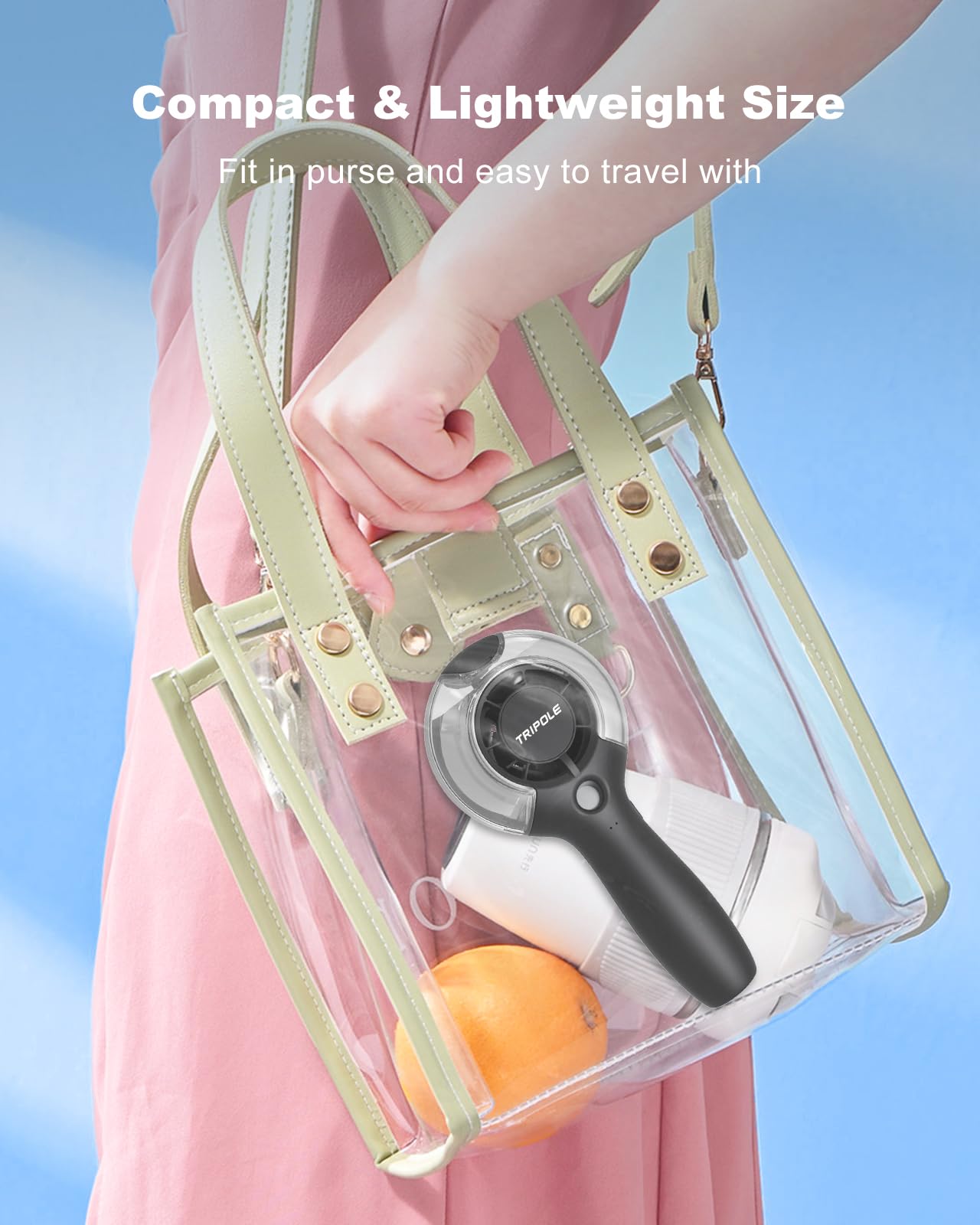 Q: Is the TriPole Misting Fan portable and easy to carry?A: Absolutely! The TriPole Misting Fan is compact, measuring only 7 inches in length, making it easy to fit in a purse or travel bag, perfect for outdoor trips, concerts, and beach days.