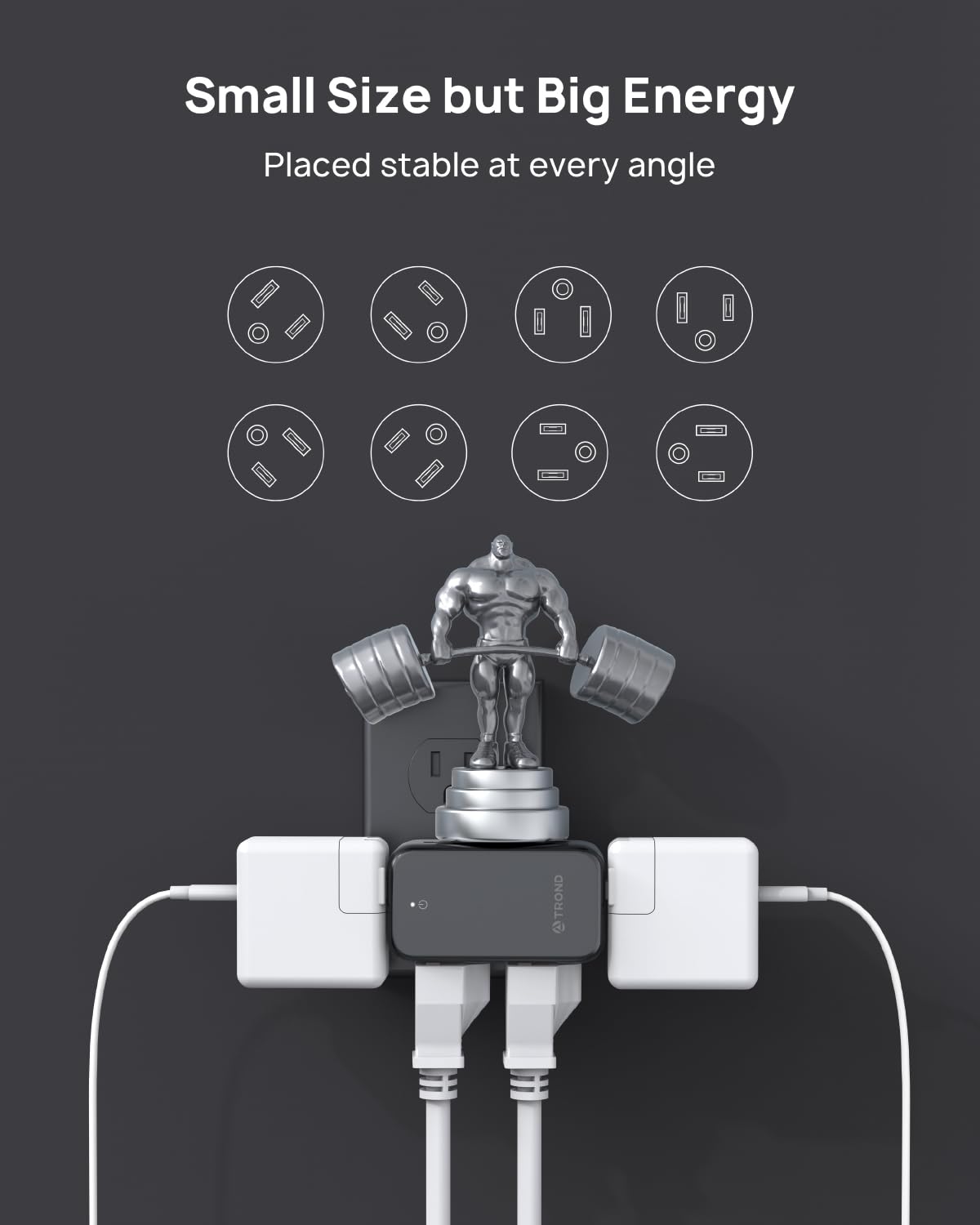 Q: What is the size of the TROND Outlet Adapter, and how does it fit in tight spaces?A: The compact design of the TROND Outlet Adapter measures 3.17 x 1.77 x 1.75 inches, allowing it to fit comfortably behind appliances and furniture without taking up extra space. This makes it an ideal solution for areas where space is limited.