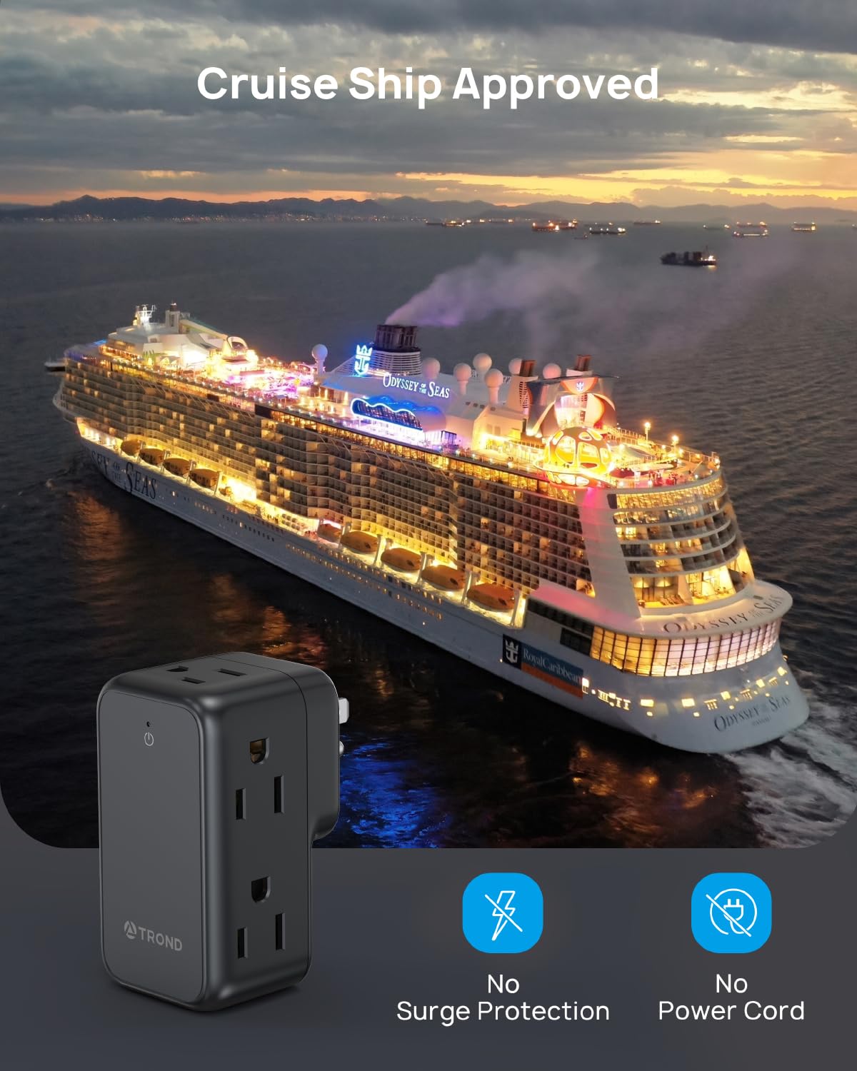 Q: Is the TROND Outlet Adapter suitable for use on cruise ships?A: Yes, the TROND Outlet Adapter is cruise ship approved as it has no surge protection and no cords. This design complies with the electrical requirements of major cruise lines such as Carnival, Royal Caribbean, and Disney, making it a perfect travel companion.