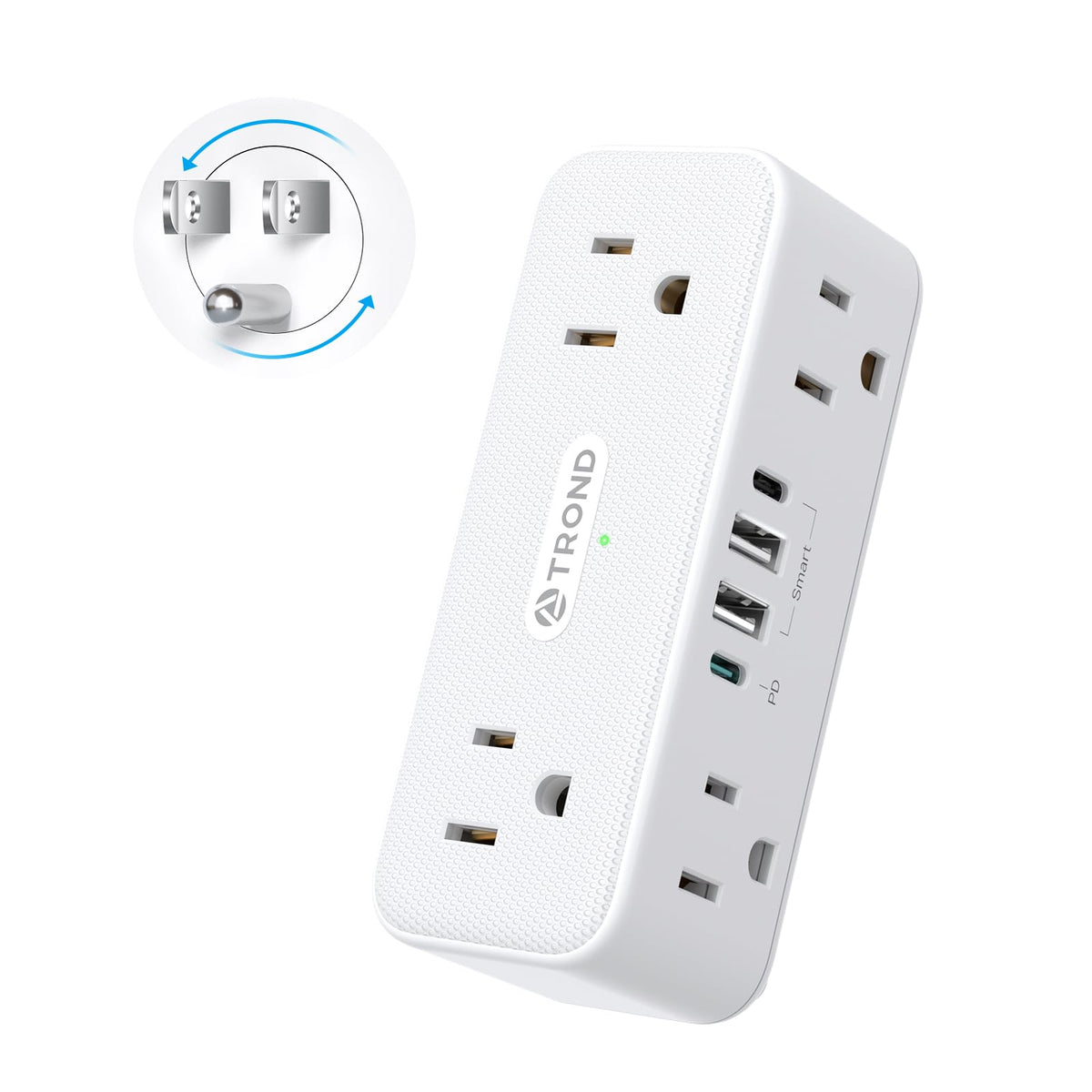 Trond Outlet Extender Surge Protector, 6 Ac Outlet Splitter With 360 Rotating Plug, Multi Plug Adapter With Pd 20W Usb C, 900J, 2 Usb-A & 2 Usb-C, 3-Sided Wall Extension Outlet For Home Office Travel. 10-In-1 Multi Plug Outlet Extender: With 6 Ac Outlets, 2 Usb-C Ports And 2 Usb-A Ports On 3 Different Sides, This Rotating Outlet Splitter Allows You To Power Up To 10 Devices Simultaneously, Great For Plugging In Your Laptop, Phone, Watch, Lamps Or Other Electric Devices. 360 Rotating Outlet Adapter: This Swivel Plug Extension Outlet Can Rotate 360 Degrees, Which Allows You To Place It In Any Configuration You Need, Horizontally Or Vertically Whichever Best Suits Your Situation. No More Struggling To Fit Bulky Plugs Into Tight Spaces! Pd 20W Usb C Fast Charging: The Pd 20W Usb C Port Enables You To Charge Your Iphone Series Or Other Electronic Equipment Up To 3 Times Faster Than The Original Charger. 20W Charging Is Only Achievable When The Pd Port Is Used Separately. Compact & Portable: With A Compact Size Of 4.33*1.73*1.57In (L*W*H), This Wall Outlet Extender Is Space-Saving And Easy To Carry. Easily Fit Into Tight Spaces, Luggage And Briefcases, Perfect For Your Home, Office Or Travel. Universal Voltage Compatibility: 100~250V.3-Sided Widely-Spaced Design: By Having Two Outlets On Three Different Sides And 2.64In Wide Space Between Each Two Ac Outlets, This Multiple Outlet Wall Plug Allows You To Plug In Larger Items Without Crowding Or Blocking Adjacent Outlets.Reliable Surge Protector Outlet: This Wall Plug Extender Offers 900J Surge Protection, Providing Peace Of Mind For Your Valuable Electronics And Appliances. Being Made Of Ul94 V-0 Flame-Retardant Pc+Abs, Which Improves The Safety And Durability Of This Swivel Plug Adapter.