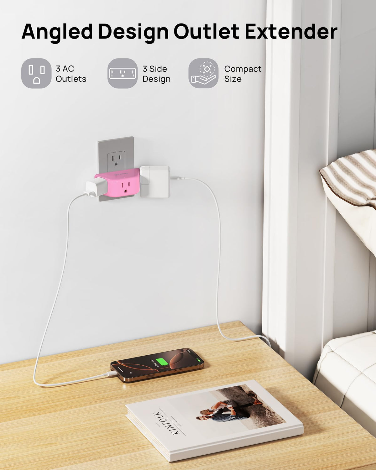 Trond Pink Outlet Extender - Multi Plug Outlet With 3-Prong Grounded Sockets, 3 Way Angled Plug Splitter, Compact And Practical