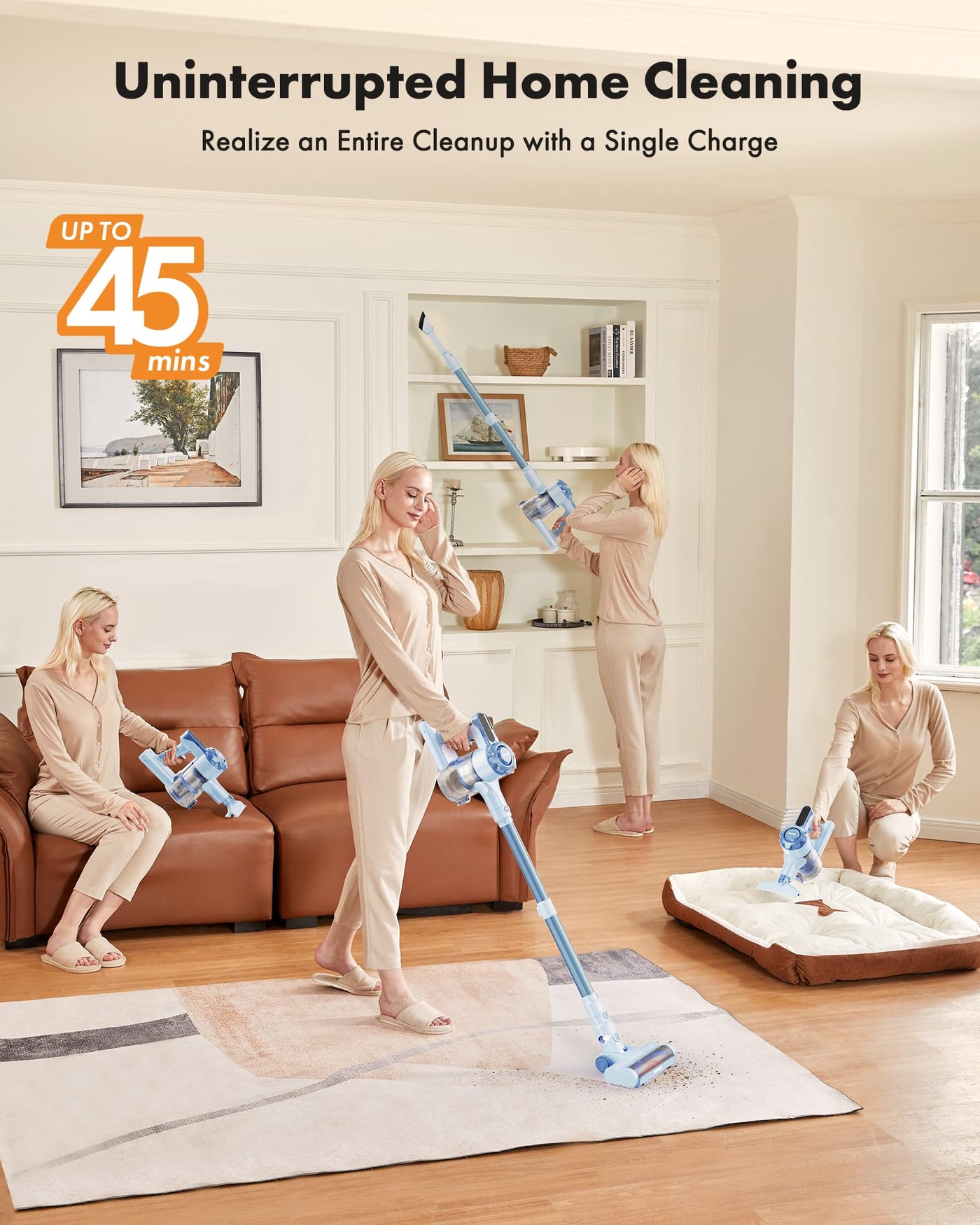 Q: How long does the battery last on a full charge?A: The Trucozie Cordless Vacuum Cleaner features a rechargeable battery that provides up to 45 minutes of runtime in energy-saving mode, 25 minutes in mid mode, and 20 minutes in max mode, allowing you to clean your entire home on a single charge.