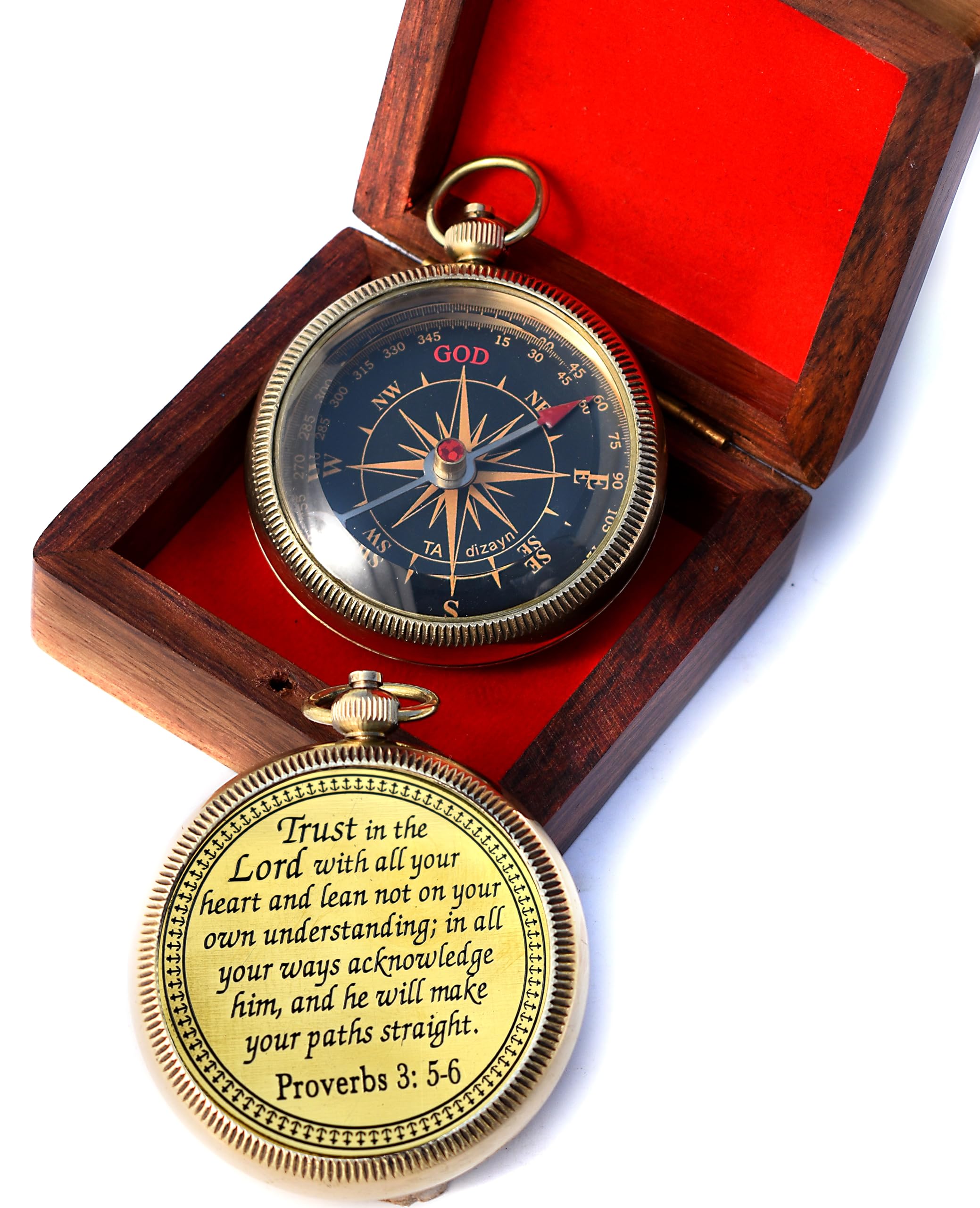 Trust In The Lord With All Your Heart -Proverbs 3: 5-6 Quote Engraved Compass With Wooden Box, Camping Compass, Boating Compass, Gift Compass, Graduation Day Gifts