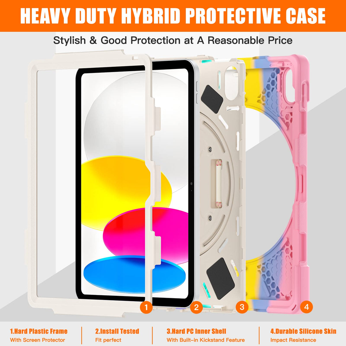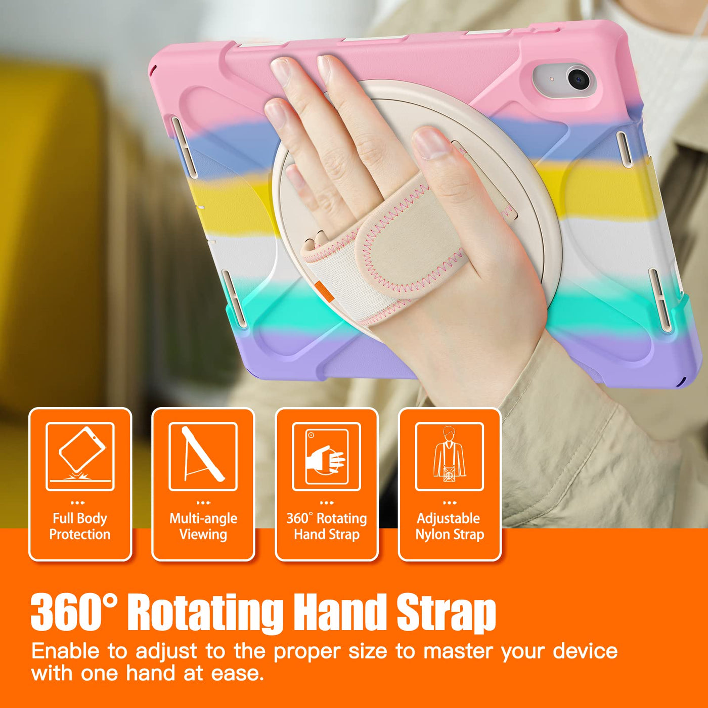 Q: What are the main features of this iPad case?A: The case features a colorful girly pink design, a rotating stand for 360-degree flexibility, an adjustable hand strap, and a shoulder strap for easy carrying. It also includes a screen protector for added durability.