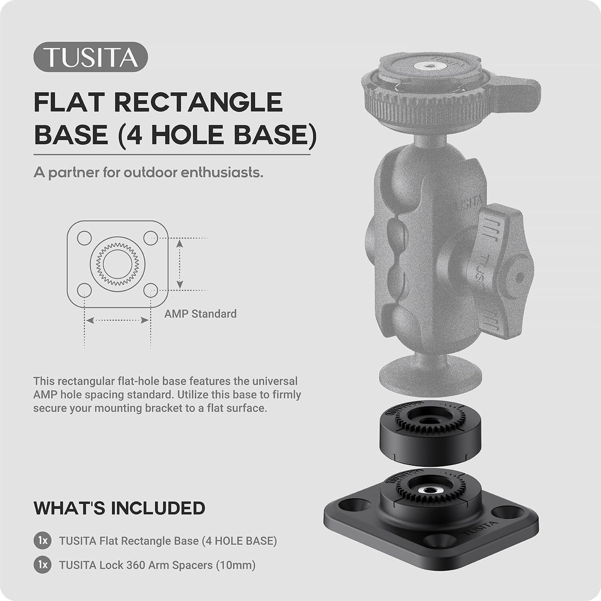 Overview Securely Attach Your Mount To Flat Surfaces Using Our Rectangle Flat Hole Bases. Bases Are Constructed With Durable Nylon And Follow The Universal Amps Hole Spacing Standard. Tech Specs Material:High Strength Composite Size:58.2Mm (2.29'') Long X 50.1Mm (1.97'') Wide X 13.1Mm (0.52'') High Amps Hole Pitch: 38Mm (1.5'') X 30Mm (1.2'') What'S In The Box 1 X Flat Rectangle 4 Hole Base 1 X 10Mm Spacers 1 X M5X30 Screw (For Connecting Spacer To Lever Head Or 360 Arm) 1 X M5X45 Screw (For Connecting Spacer To Weatherproof Wireless Charging Head)