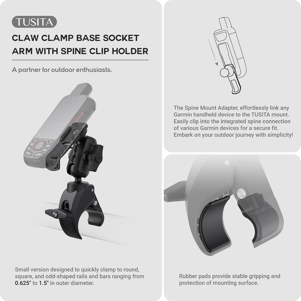 Overview Secure Your Compatible Device On Round, Square, And Odd-Shaped Rails And Bars. The Mount Is Designed For One Handed, Quick-Release Operation To Allow Easy Grab-And-Go Accessibility. Tech Specs Clamp Range:0.625'' - 1.5'' Diameter Materials:High Strength Composite What'S In The Box Tusita Small Claw Clamp Base With 1''Ball X1 Tusita Double Socket Arm 1'' - B Size Short X1 Tusita Spine Clip Holder With B Size 1'' Ball X1