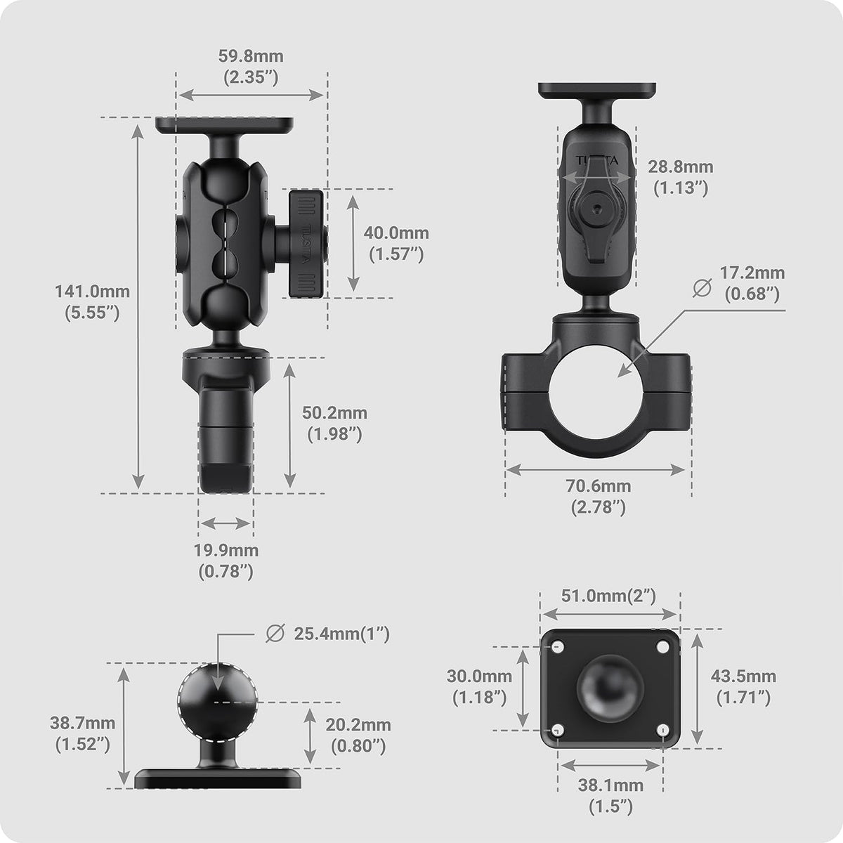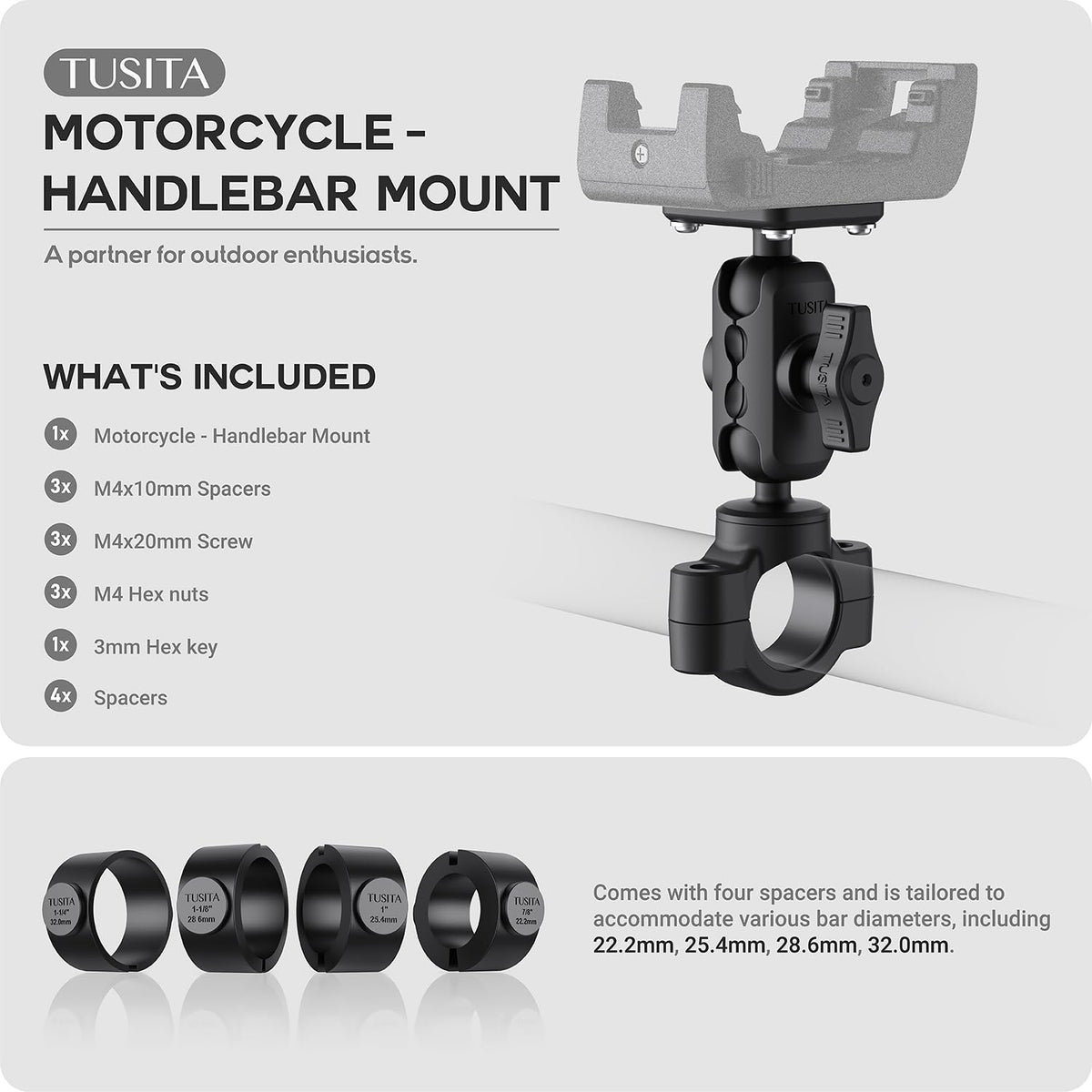 Overview Consists Of The Tusita Lock 360 Small Rail Base With 1'' Ball, Short Length Double Socket Arm And Tusita Amps Plates 1'' Ball For Montana ,Zumo Xt Gps Tech Specs Fits Handlebar Sizes:22.2Mm (? ), 25.4Mm (1 ), 28.6Mm (1-? ), 32Mm (1- ) (Diameter) Materials:High Strength Composite,Marine-Grade Aluminum What'S In The Box Tusita Small Rail Base With 1''Ball X1 Tusita Double Socket Arm 1'' - B Size Short X1 Tusita Ball Adapter With Amps Plate - B Size X1