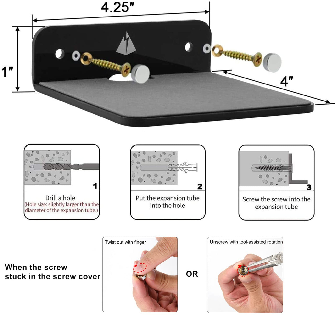 Universal Compatibility: Suitable For All Small Portable Speakers Even With An Outer Case, Hold Speakers Or Smart Devices Up To 800 G. Mount Behind Your Bed With Speaker/Small Toy/Alarm Clock On It. Convenient And Attractive To Hold Small Speakers/Smartphones/Mirrorless Camera/Monitor/Alarm Clock/Alexa/Smart Devices In Room, Kitchen,Office Etc.Usb Cord Access Hole With Slot To Position And Conveniently Retain Plugs And Cords.Easy To Install: Please Kind Follow The Picture Instructions: Drill A Hole In The Wall; Put The Expansion Tube Into The Holecrew The Screw Into The Expansion Tube.Material: Acrylic,Screw; Dimensions: 4.25 (L) X 4 (W) X 1.25 (H);Package Include: 1X Acrylic Wall Speaker Holder Mount