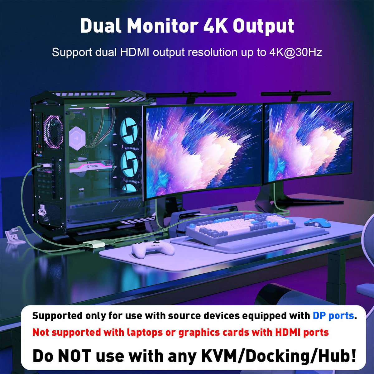 Q: Can this adapter be used with a docking station or KVM switch?A: No, the UANTIN DisplayPort to Dual HDMI Adapter should not be used with any HUB, docking station, or KVM switch. It is designed to be directly plugged into the DisplayPort of the source device for optimal performance.