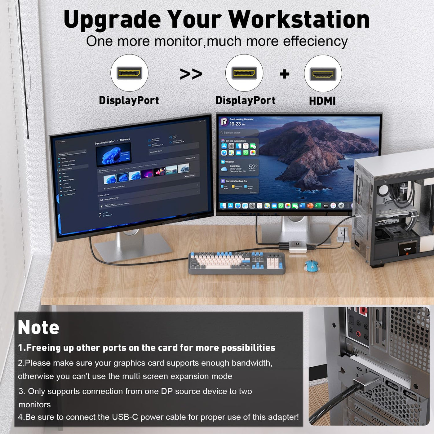 Product Description This Displayport To Hdmi And Dp Dual Monitors Splitter Connects All Dp/Dp++/Displayport++ Equipped Hosts/Laptops/Video Cards To One Dp Monitor As Well As One Hdmi Monitor. The Resolution Supports Both 4K@30Hz And Can Be Mirrored And Extended. The Product Supports Mst Multi-Screen Expansion Function. Parameters: When Using One Of The Dp To Displayport And Hdmi Splitter Ports For Video Output, The Maximum Supported Resolution Is 4K@60Hz. When Using Both Video Ports At The Same Time, The Resolution Can Support Up To 4K@30Hz At The Same Time. When Connecting And Using The Product, Be Sure To Connect The Usb-C Power Port To Provide Sufficient Current For The Built-In Chip. Please Be Sure To Connect The Usb-C Power Port To Provide Sufficient Current For The Built-In Chip. Cautions 1. Do Not Use With Any Hub/Dock/Kvm, Please Plug The Dp Port Of The Displayport To Dp Adapter Directly Into The Source Device For Video Transmission. 2. Please Connect The Usb-C Power Port To Provide Current For The Built-In Chip Of The Product To Get The Best Display Effect. 3. Please Make Sure Your Source Device And Display Device Both Support 4K Resolution, Otherwise You Will Not Be Able To Get Hd Video.