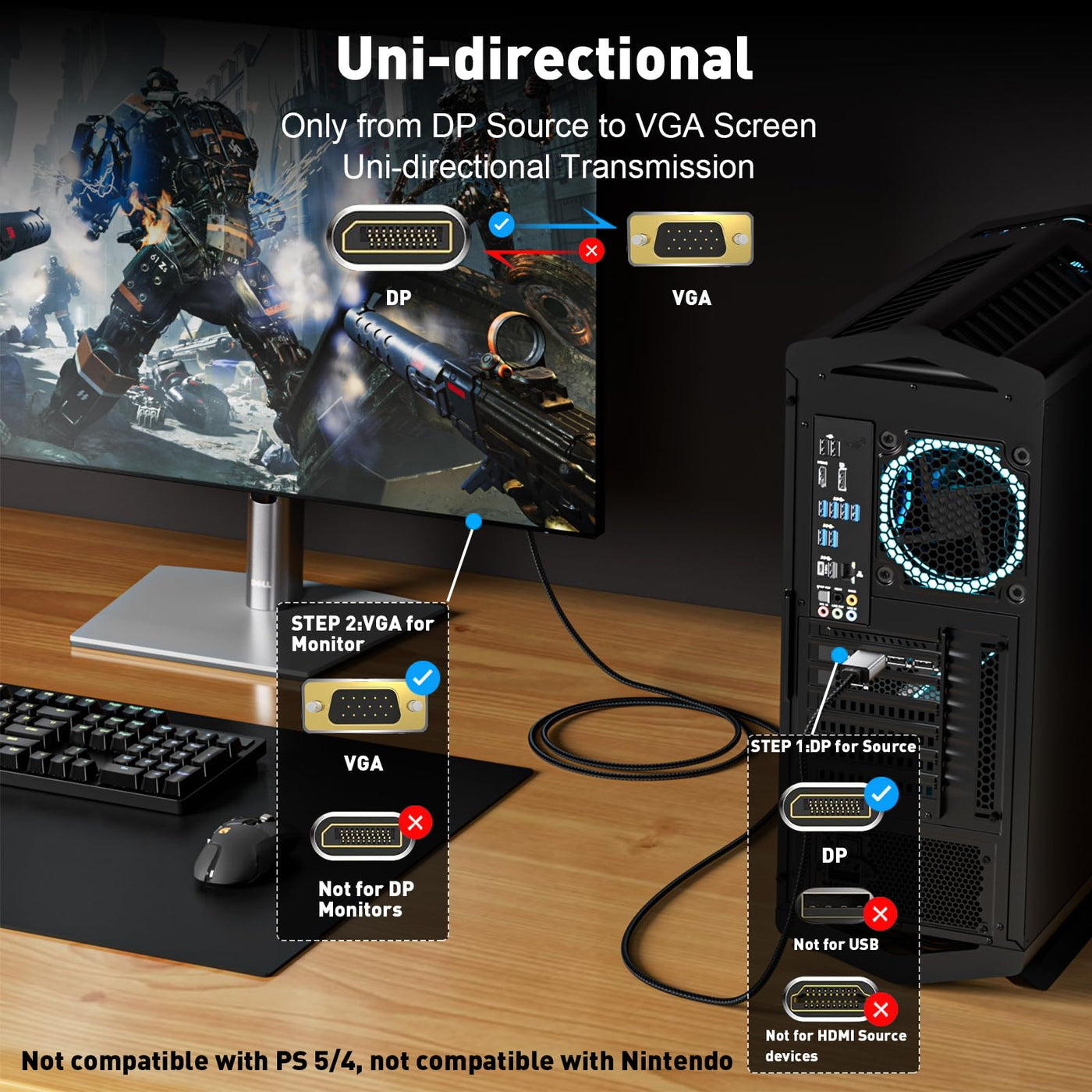 Uantin Displayport To Vga Adapter Cable Is Made From The Best Combination Of Materials, Using Gold-Plated Anti-Interference Connectors, High-Quality Aluminum Alloy Housing, And Multi-Layer Shielded Copper-Conducted Braided Mesh Cables To Take The Product To An Unprecedented Level. This Will Give You More Texture And Longer Life Than Plastic Dp To Vga Cables. The Display Port To Vga Cable Supports Resolutions Up To 1080P@60Hz And Is Backward Compatible With 1080P@30Hz, 720P,720I, Etc. The Display Port To Vga Cable Can Be Used For A Wide Range Of Applications. It Can Provide You With Clear And Smooth Video Images. Transmit Directly From Devices With Dp/Displayport++ To Vga Monitor, Tv Or Projector. No Driver Installation, No External Power Supply, No Wasted Time, You Can Get Life-Like 3D Video Directly. Note: The Product Is Unidirectional, Not Bidirectional Transmission. Only Support From Dp Source Device (Pc,Graphics Card) To Vga Display Device (Tv, Monitor, Projector). The Product Cannot Be Used With Any Kvm/Hub/Docking And Cannot Be Used With Any Hdmi Device. Cannot Be Used With Other Hdmi Adapters, Dp Adapters. Please Connect The Cable Directly To The Device.