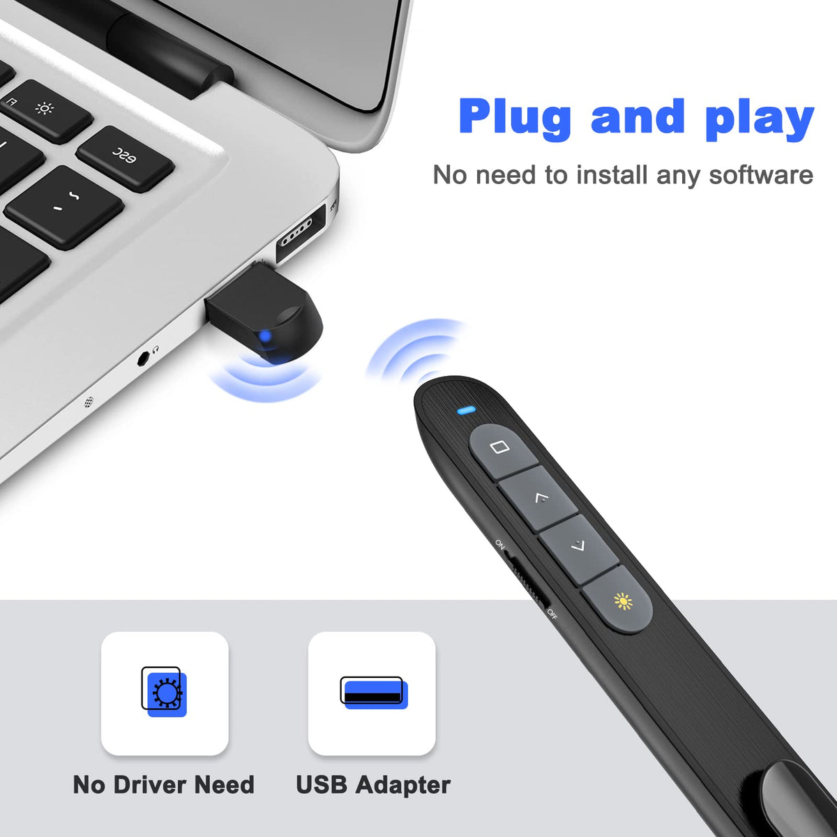 Q: Is the UBUYONE Wireless Presenter easy to set up?A: Yes, the UBUYONE Wireless Presenter features a plug-and-play design, which means you can simply connect the USB receiver to your computer without needing to install any software. This ease of setup makes it user-friendly for quick presentations.