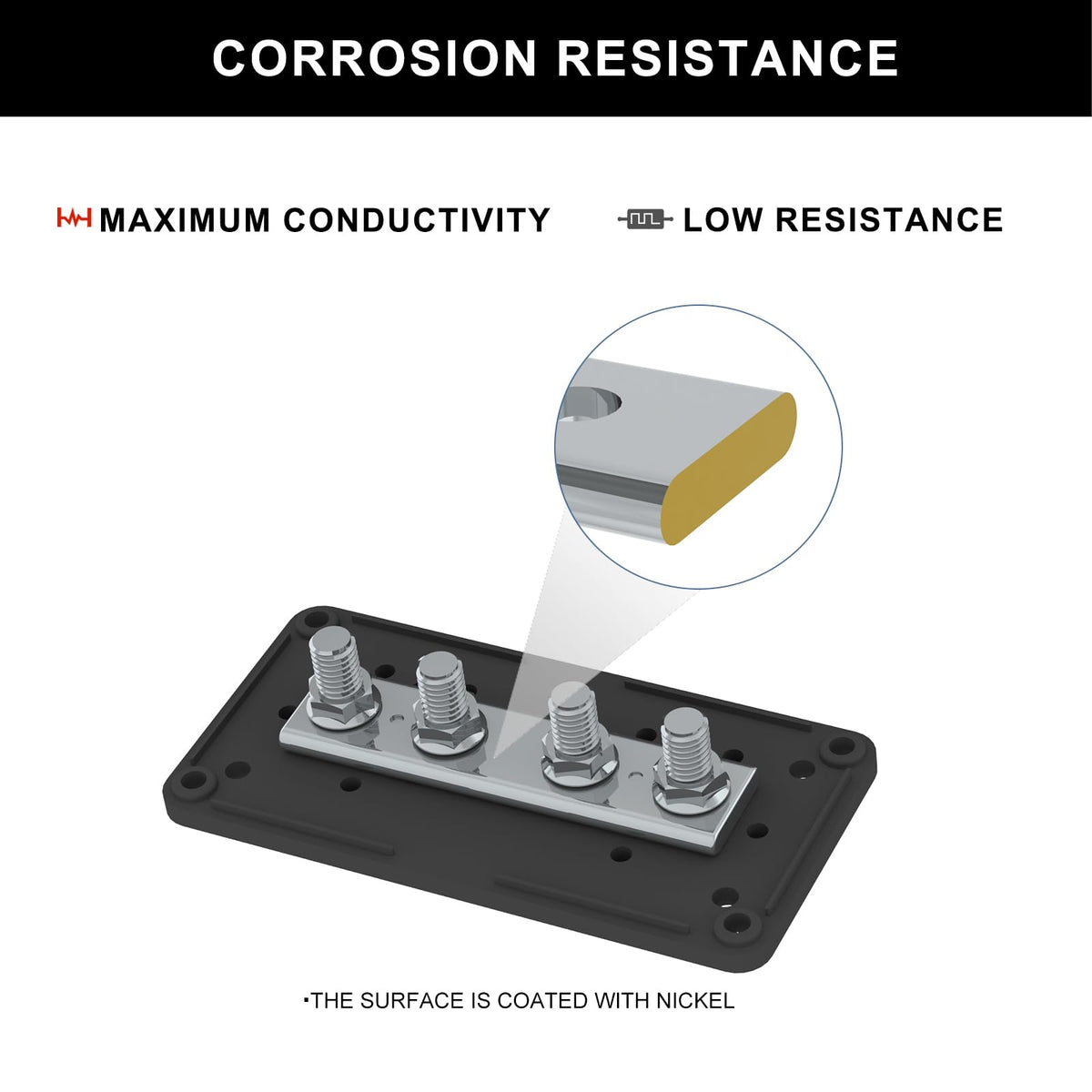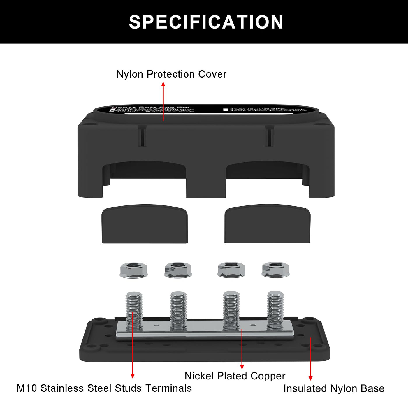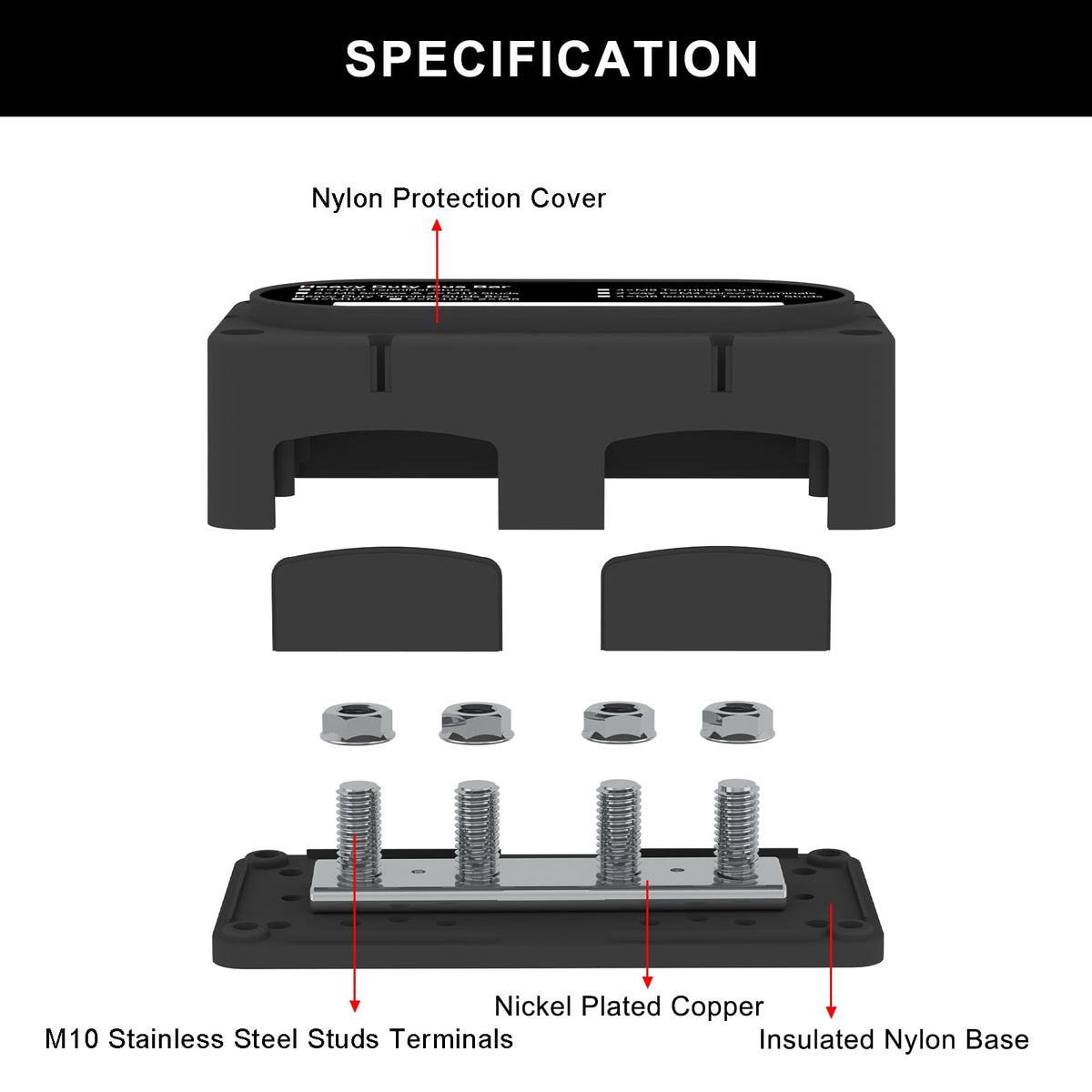 Q: How do I connect multiple devices to the bus bar?A: The bus bar features 3/8" (M10) 4-post terminals that allow for easy and secure wiring connections, providing flexibility in connecting multiple electrical devices or components.