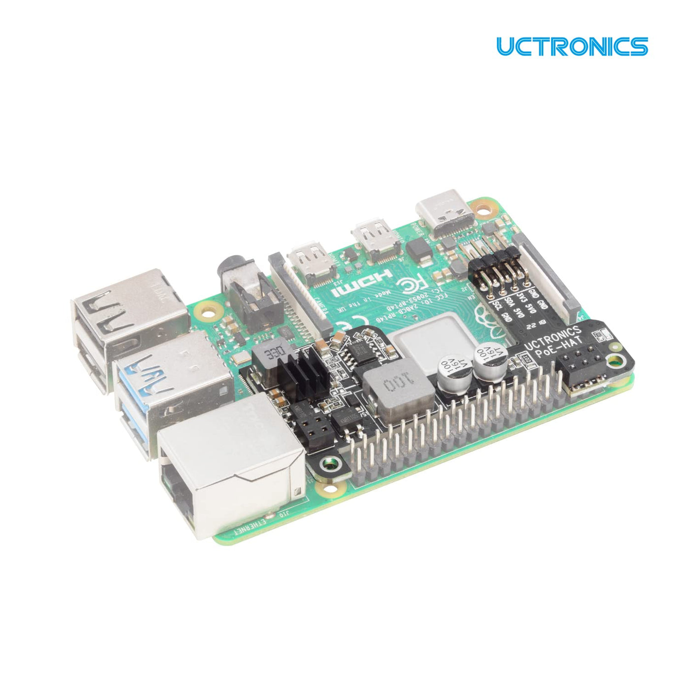 Q: What is the UCTRONICS PoE HAT for Raspberry Pi 4B?A: The UCTRONICS PoE HAT for Raspberry Pi 4B is an expansion board that allows you to power your Raspberry Pi using Power over Ethernet (PoE) technology. It is compatible with Raspberry Pi 4 Model B and Raspberry Pi 3 Model B+, enabling a single Ethernet cable to provide both network connectivity and power.