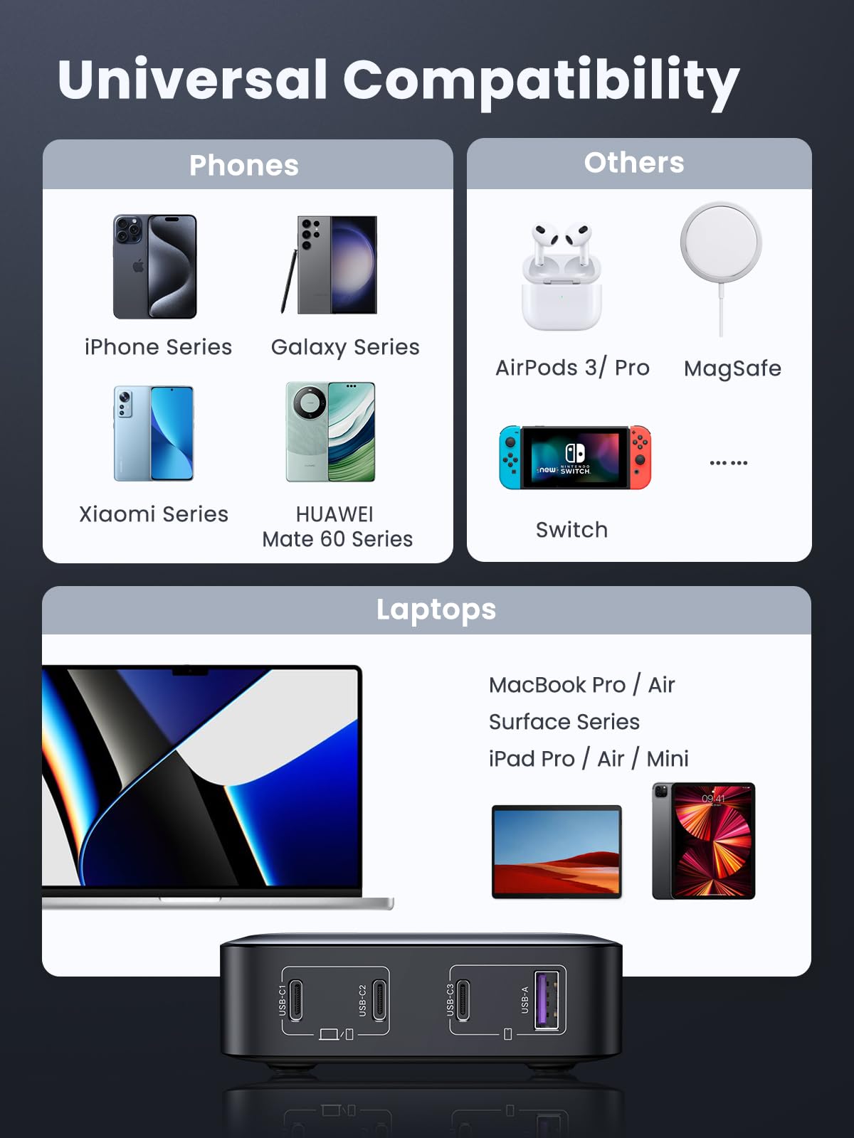 Ugreen 100W Usb C Charger, Nexode 4 Ports Usb C Charging Station, Gan Fast Desktop Charger Compatible With Macbook Pro, Dell Xps