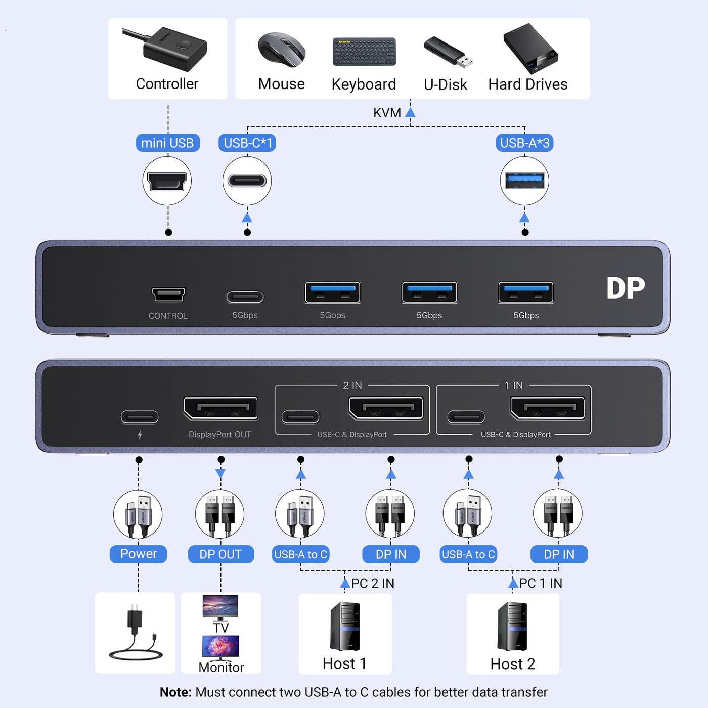 8K Displayport Kvm Switch Dp 1.4 With 4 Usb 3.0 Ports Support 8K@60Hz 4K@240Hz Share 1 Monitor Keyboard Mouse Usb C Hard Drive Printer, With 2 Dp Cables, 2 Usb A To C Cables