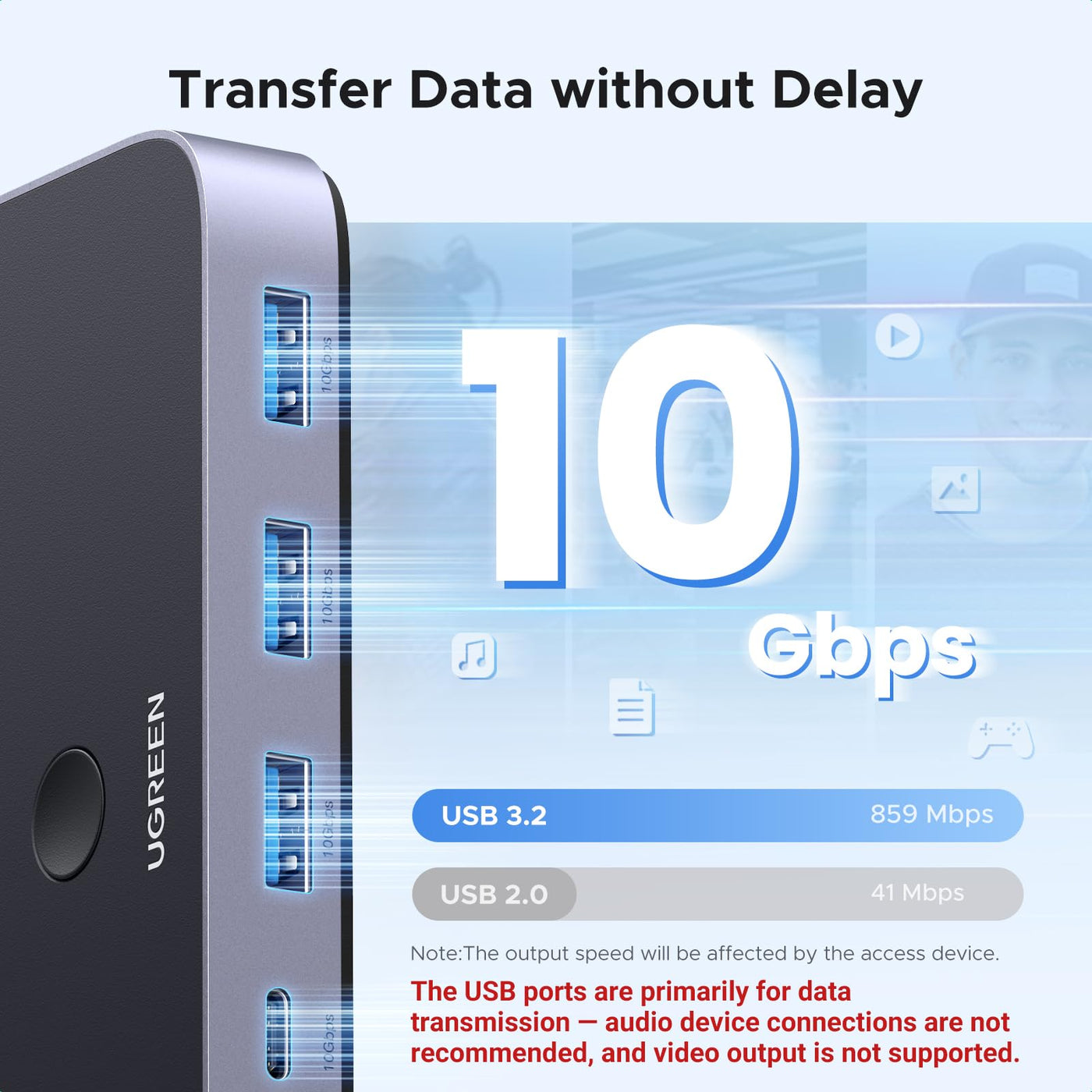 2 Usb-C Pcs Share Multiple Devices: Ugreen 4-In 2-Out Usb C Switcher Supports 2 Mac Computers Sharing 4 Usb Devices Like Keyboards, Mouses, Headphones, And Usb Cameras. Switch Freely Between Your Work Computer And Personal Laptop And Boost Your Work Efficiency. 10Gbps Transfer Speed: The Usb-C Switch Is Equipped With 4 Usb 3.2 Gen 1 Ports And Speeds Up To 10Gbps. Transfer 1Gb Of Files In 1 Second To Improve Work Efficiency Without Waiting. Performance Upgrade:: Simple Plug And Play Without Installing Drivers And Enough To Drive Most Devices Without The Need For Additional Power. Connected To Usb A Computer Does Not Need To Provide A Usb Adapter, Just Use A Usb A To C Data Cable (Not Included In The Package) Connect Usb C & Usb A Devices: The Usb 3.2 Switch Provides 1 Usb C Port And 3 Usb A Ports To Support Connecting Various Usb Devices. Usb C Ports Can Be Connected To A Usb C Hub Or Other Usb C Devices, Extending More Ports For Two Computers. Two Switching Modes: The Usb Switcher Has Two Switching Modes-Remote Control And Button, You Can Switch Devices As You Like.