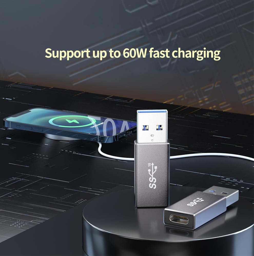 Adapts Usb 3.0 Type-A Female Port To Usb Type-C Female Port, Which Is Convenient For The Latest Devices And Data Cables With Type-C Male Connector To Connect And Transfer Data Signals At High Speed. Supports Up To 10Gbps Data Transfer, 60W Fast Charging (Requires Power Supply And Charging Cable Support). Built-In Professional Chip For More Stable High-Speed Transmission And Stronger Performance.The Single-Chip Model Can Only Achieve 10Gbps Transfer Rates On One Side. The Dual-Chip Model Allows For 10Gbps On Both The Front And Back, For Even Less Effort. Thickened Aluminum Alloy Shell, Strengthen The Internal Circuit Protection.Designed With Precision Injection Molds, The Pvc Plastic Is Filled Into The Aluminum Case At High Speed, And Aluminum Shell Groove Into One, Firmly Locking The Aluminum Shell, More Than 10,000 Times Of Plugging And Unplugging Stability Does Not Come Off. Supports Usb-C Headphones For Lossless Sound Quality.It Also Supports Carplay, Microphone, Power Amplifier And More.No Longer Limited By The Port, Expanding More Possibilities.