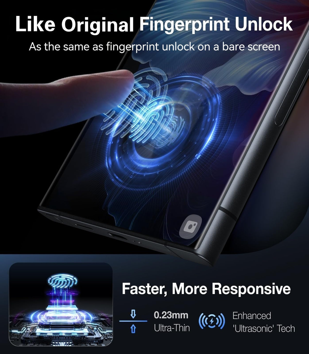 Q: Can I use my fingerprint sensor with the UltraGlass screen protector?A: Absolutely! The UltraGlass screen protector is designed with a 0.1s original screen-like fingerprint reader, ensuring full functionality and responsiveness of your fingerprint sensor.