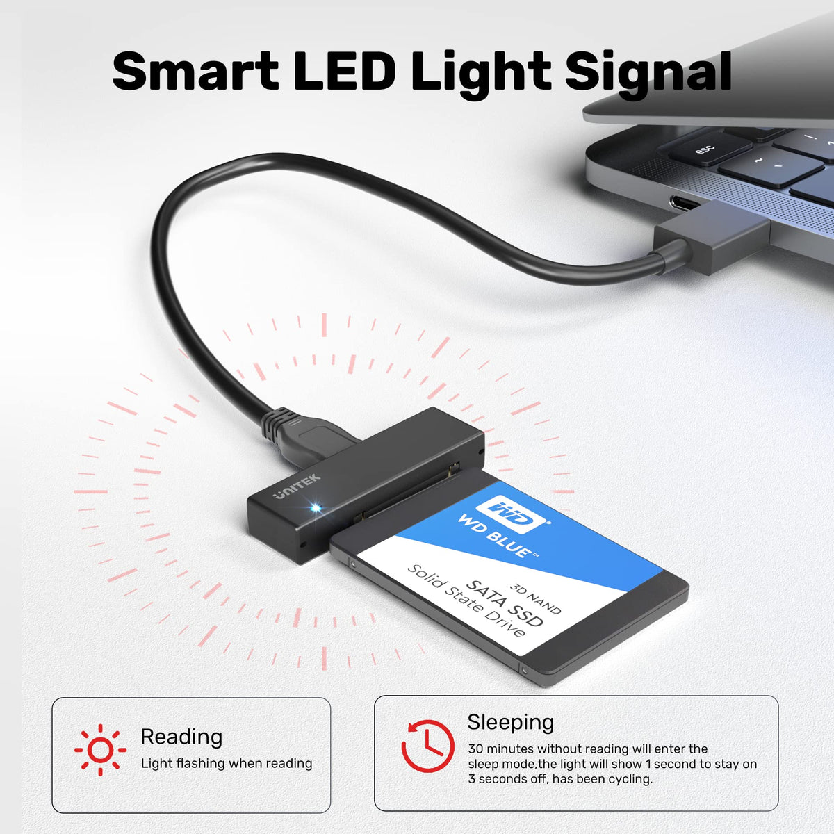 Q: How fast is the data transfer rate with this SATA to USB adapter?A: The Unitek adapter supports SuperSpeed USB 3.0 data transfer rates of up to 5 Gbps, while SSDs can achieve transfer speeds of up to 6 Gbps, depending on the capabilities of the connected device.