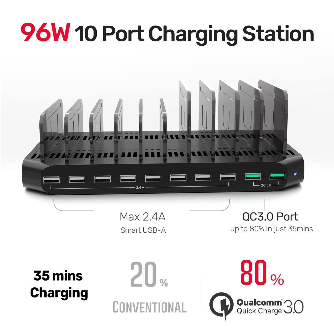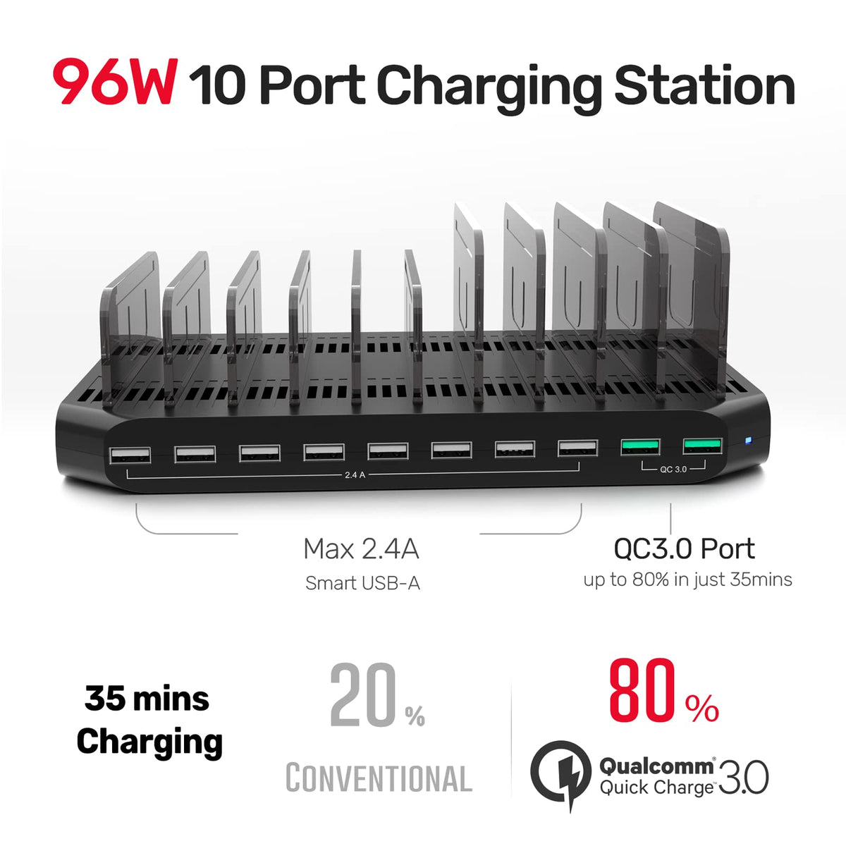 Desktop Usb Fast Charging Station Charges Up To 10 Usb Devices Simultaneously With 1 Power Supply. 11 Baffles Allow You To Divide The Area Up To Match Your Devices, Holding A Large Number Of Gadgets. It Is An Ideal Solution For You To Charge All Your Power-Hungry Devices Easily. It'S Suitable For Corporate, Home, School, Public Transport Station, Restaurant Etc. Safe Charger The Load Is Controlled In Accordance With A Specific Program Of A Microcontroller, Which Adjusts The Current And The Charging Time According To The Capacity. Awarded The Us Department Of Energy'S Highest Possible Energy Efficiency Rating (Doe 6). Quick Charge 3. 0 Compatible Devices (Quick Charge 2. 0 Compatible) Samsung Galaxy S7, S7 Edge, S6, S6 Edge, Edge Plus, Note 5, Note 4Sony Experian Z4, Z4 Tablet, Z3, Z3 Compact, Z3 Tablet Compact Htc One 10 (Lifestyle) A9, M9, M8, Lg G5 G4, Lg G Flex2, Lg V10, Google Nexus 6For A Complete List Of Compatible Devices, Please Refer To Qualcomm'S Website. Specifications*Input: Ac100-240V/50-60Hz*Output: Dc5V/ 19. 2A Max (Total Output Capacity) *Power Supply: 96W 12V/8A*Led Indicator: Power / Access* Regulatory Approvals: Ul / Cull, Ce, Fcc, Rohs -2-Year Ocean Technology Llc -24H Customer Email Support