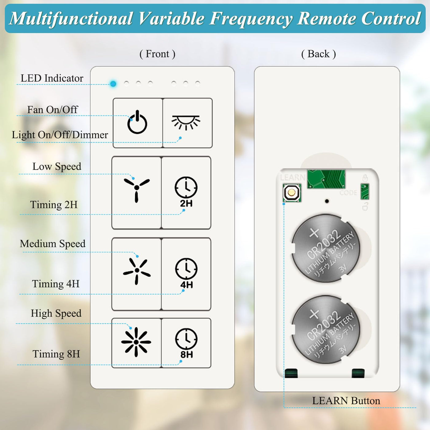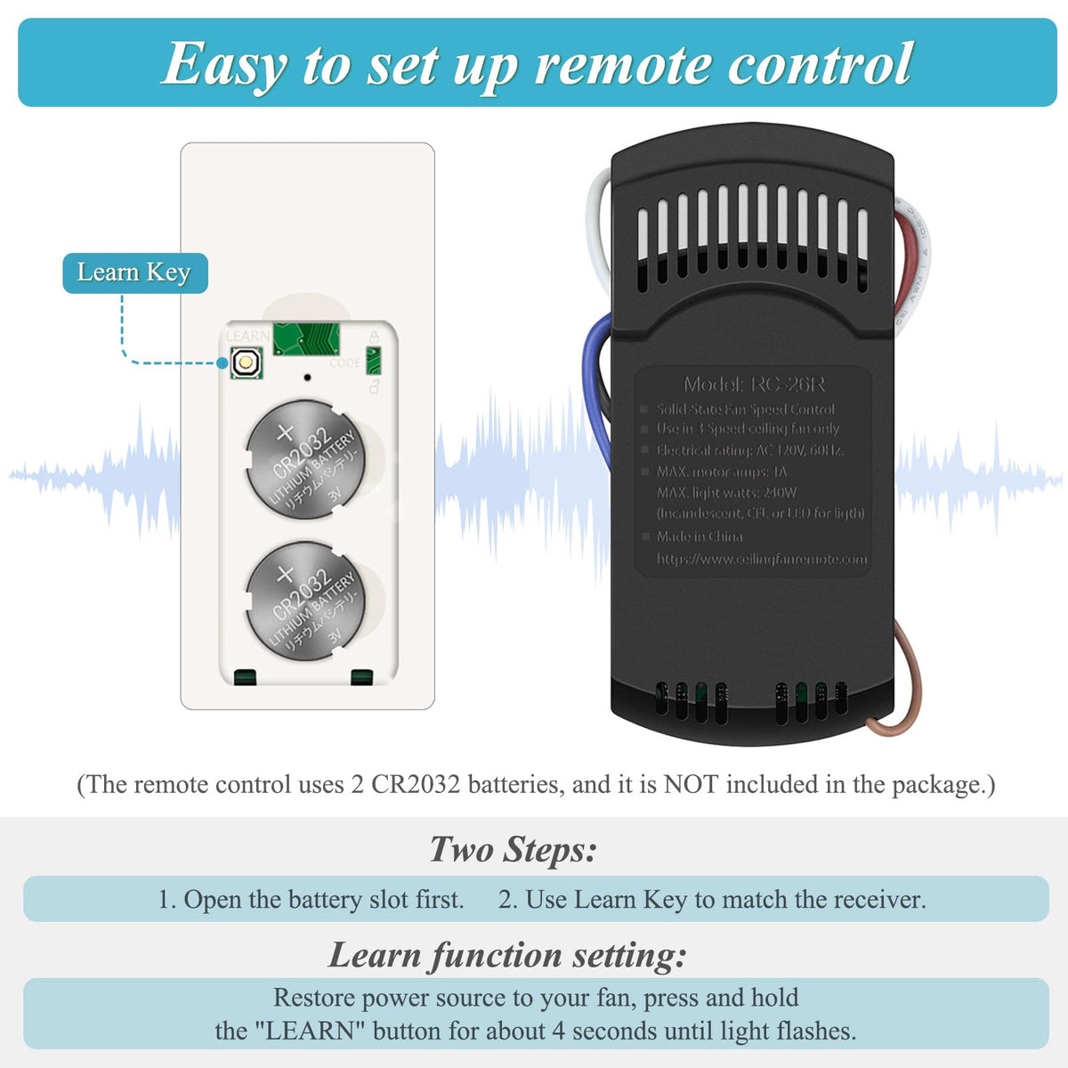 Universal Ceiling Fan And Light Remote Control Kit Say Goodbye To Single Control To Your Ceiling Fan Light Via Pull Chain Or Wall Switch! Ceiling Fan Controller Is Suitable For Most Three Speed Ceiling Fan Light, Like Hunter, Harbor Breeze, Westinghouse, Honeywell And Others Well-Known Brands. Upgrade Your Pull Chain Ceiling Fan Or Wall Switch Ceiling Fan Light With This Smart Controller In Few Steps. This Ceiling Fan & Light Remote Control Kit Has The Function Of Dimming. The Light Dimmer Compatible With Incandescent Light Bulbs And Some Dimmable Led Lamps. Most Led Lights And All Cfl Lights Are Non-Dimmable, Light Dimmer Only Supports The On/Off Function In That Case, And It May Cause To Flicker When Using The Dimming Function. The Ceiling Fan Control Enables You To Adjust The Fan 3 Speed, Turn On/Off Light, And Time Schedule Settings. Make Your Life Easier And More Convenient. Learn Key Button The Production Settings Of This Smart Ceiling Fan Remote Control Kit Have Been Configured And Can Be Used Directly. If It Fails To Work, Please Use The Learn Button To Re-Match. How To Set The Function Of Learning Button: 1. Disconnect The Receiver'S Power Cord And Connect It Again To Restart The Receiver. 2. Please Press The ''Study Button'' (It Is A Small Hole In The Battery Case, You Need To Use The Needle To Press It) Of The Remote Control Within 30 Seconds And Keep This Action For 3-5 Seconds. 3. If You Hear Your Receiver Making A Beeping Sound Or The Indicator Light Flashes A Few Times, The Match Is Successful. Package Includes: 1 X Remote Control 1 X Receiver 1 X Wall Mount 6 X Wiring Cap 2 X Screw 1 X User Manual (Note: 3V Battery Is Not Included)