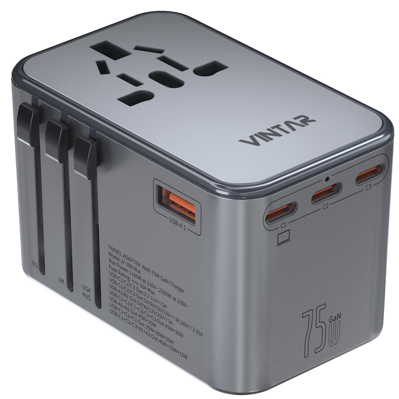 Universal Travel Adapter, Vintar 75W Gan International Power Adapter With 3 Usb-C Pd And 2 Usb-A Qc Charging Ports, All-In-One O