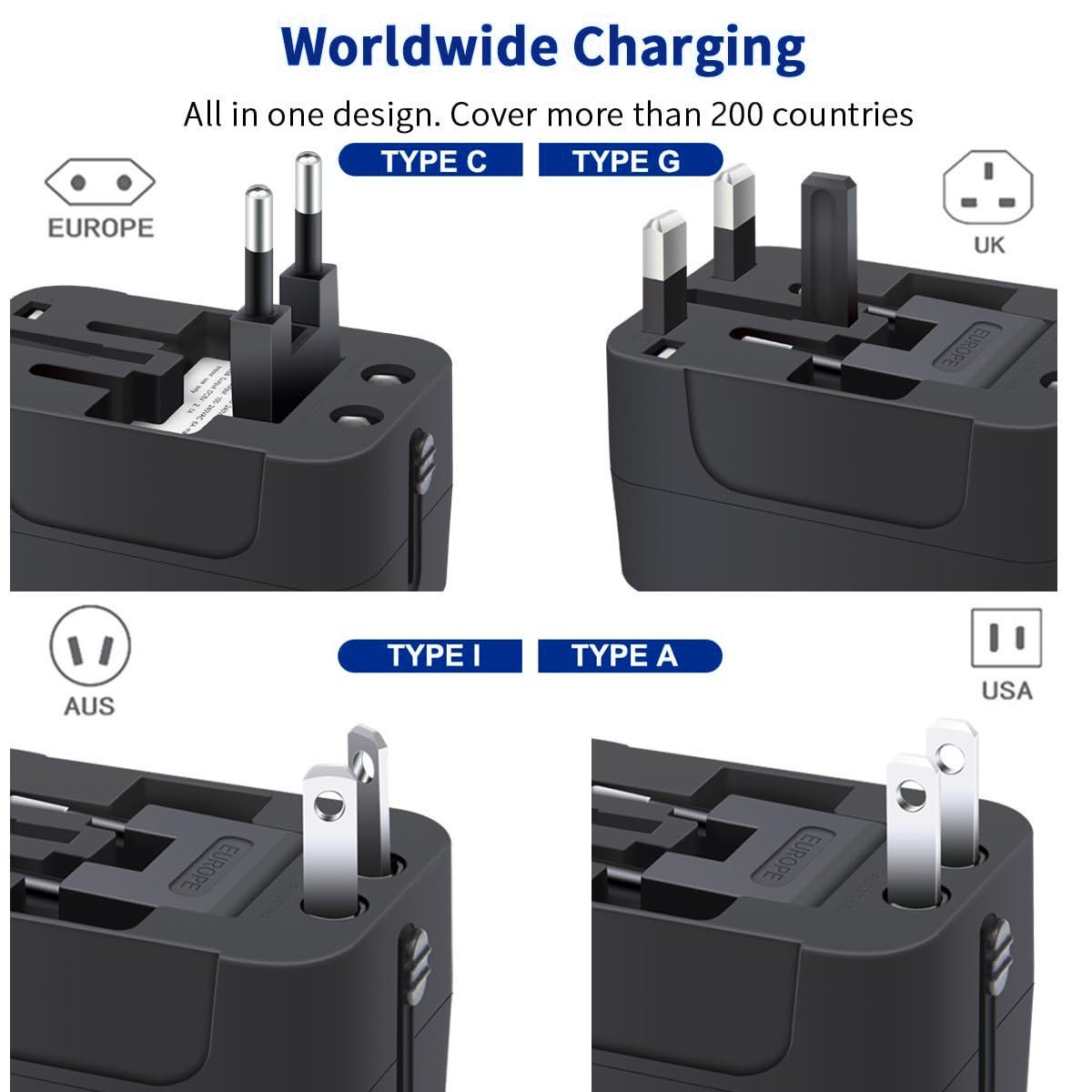 Universal Worldwide All In One Travel Adaptor With Usb C Port Adapter Plugs Do Not Convert Voltage, Ensure That Your Mobile Electronics Take Input Voltage From 100-240V. No Conversion Is Required When You Mobile Electronics Power Plug Is The Same As The Wall. Please Follow The User Instruction And Prevent Yourself From Harm And Damages. 1.You Can Charge Your Cell Phone, Camera, Ipod, Ipad And Other Electronic Products Via Specified Plugs Or Usb Port. All In One Designed Will Save Your Space And Time During The Traveling. 2.The Charger Accepts Plugs From All Countries Including China, Japan, Usa, Europe, Uk, Hong Kong, Singapore, France, German And More 150 Countries. But Cannot Be Used In South African, India, Swiss And Italy. Please Pay Attention To Avoid Any Inconvenience. 3.Built-In Safety Shutters Protect Users From The Direct Touch Of The Live Parts On The Socket Outlet, Especially For The Children.4.Only Apply To The Use Of Small Power Electric Appliances When Traveling, Such As Mobile Phone, Digital Products, Computer With Low Power Of Small Household Appliances.It Is Not Suited For High Power Appliances Such As Hair Straightener, Flat Iron, Hair Curler, Hair Dryer, Steam Iron, Hot Water Heater, Coffee Maker, Etc.