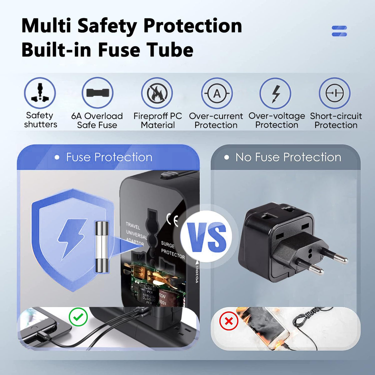 Q: What safety features does the Universal Travel Adapter have?A: The adapter includes built-in safety shutters to protect users from electric shock, especially children. Additionally, it has a fuse for protection, LED power indicator, and is made from fireproof material for added safety during use.