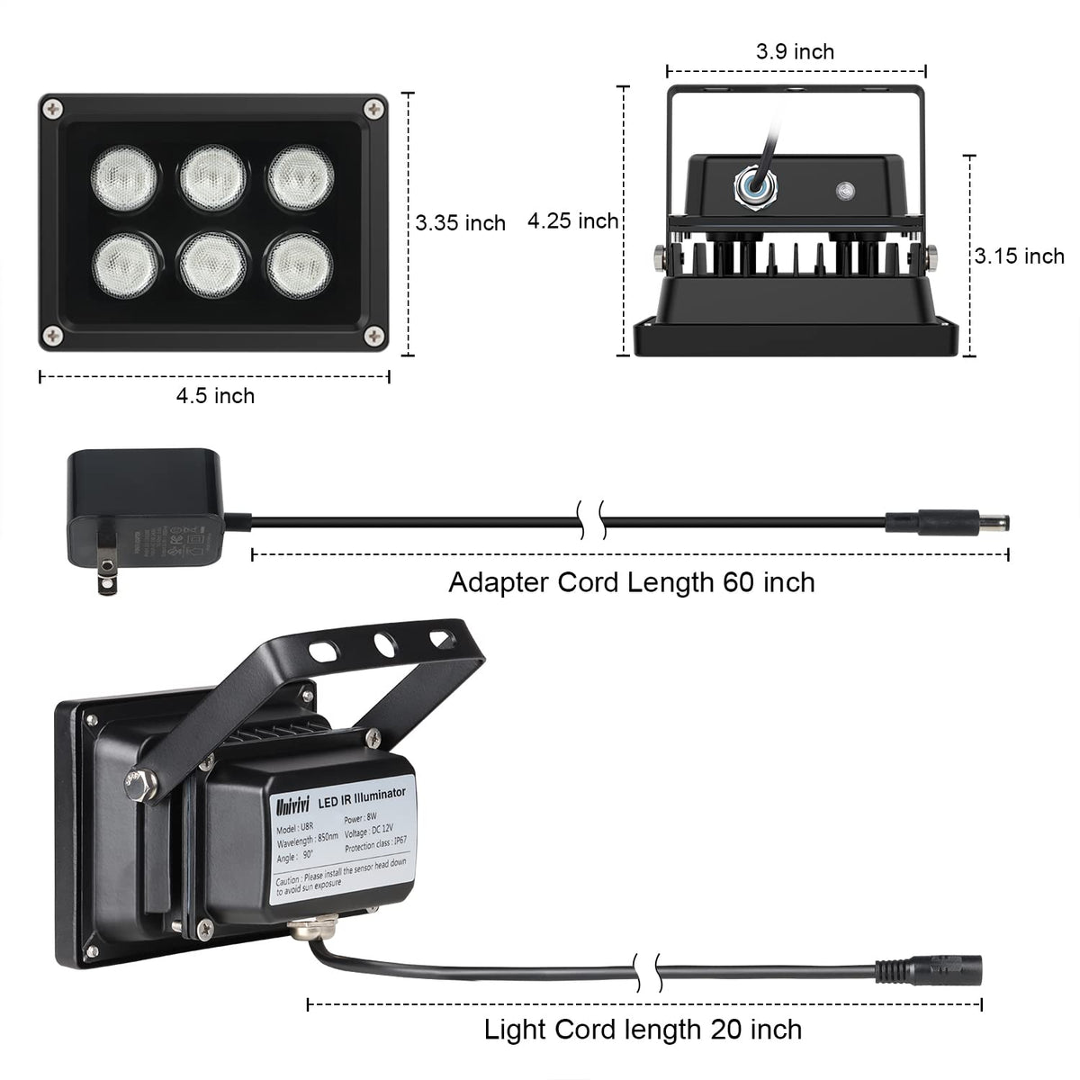 With 90 Degree Wider Angle, This High Quality Ir Infrared Illuminator Is A Good Choice To Installed With Wide Angle Ip Cameras, Cctv Camera And Improve The Quality Of Night Vision Image. Attention: 1. Please Make Sure That Your Cameras Are Sensitive By 850Nm Infrared Light Before Buy. 1. For 850Nm Led Infrared Light, If You Look Directly At The Light You Can See A Faint Red Glow Each Led, But You Do Not See Any Light Projected From The Unit. 2. For Same Quantity Of Leds, When The Led View Angle Is Wider, The Ir Distance Will Be Shorter. 3. The Ir Distance And View Angle Are For Your Referance, The Final View Distance & Angle Is Depend On Your Camera Lens. Please Choose The Ir Illuminator Best Match Your Camera Lens. Specification: Ir Leds: 6Pcs High Power Led Ir Lights Structure: Aluminum Body Light Angle: 90 Degree Led Wavelength: 850Nm Waterproof Level: Ip67 Ir Distance: 65Ft(20M) Power Input: Dc 12V/1A (Plug Size 5.5 X 2.1Mm)---Power Adapter Included Weight: 400G