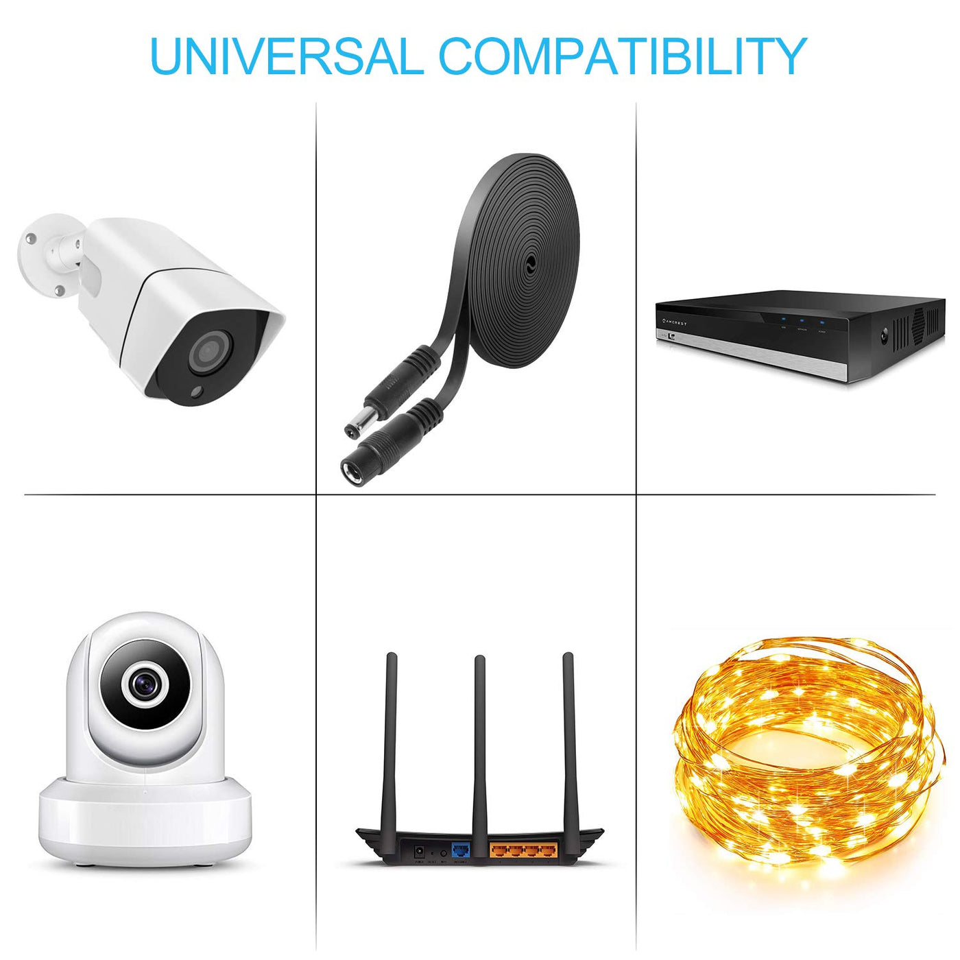 Dc 12V Power Adapter Extension Cord For Cctv/ Ip Security Camera Compatible For 12-Volt Ip Security Camera Power Adapter And Any Applications That Requires Dc Input And Accept 2.1Mm X 5.5Mm Plug Only ,20Feet Length(White). Specification Model: Extension Cable Material: Copper Wire Inside Length:20Ft/6.1M Lead: 5.5Mm(Out Size)/2.1Mm(In Size) Color: Black Note: 1> Plug Size - Please Check Your Device By Measuring The Barrel Plug Of The Power Adapter. This Cable Will Only Accept 2.1Mm (Inside Diameter) X 5.5Mm (Outside Diameter) Plugs. 2.1Mm X 5.5Mm Plugs Are Commonly Used For 9V, 12V, And 24V Power Adapter. However, Not All Such Power Adapter Uses 2.1Mm X 5.5Mm Barrel Plug. Please Check The Plugs Size Before Purchase. 2> Lack Of Power - The Longer The Cable, The More Resistance And Power Loss, And Hence Requires More Power From Power Supply. From 20Ft Length And Up, The Power Loss Is Noticeable. Please Make Sure You Have Adequate Power Supply To Use Extension Cable.