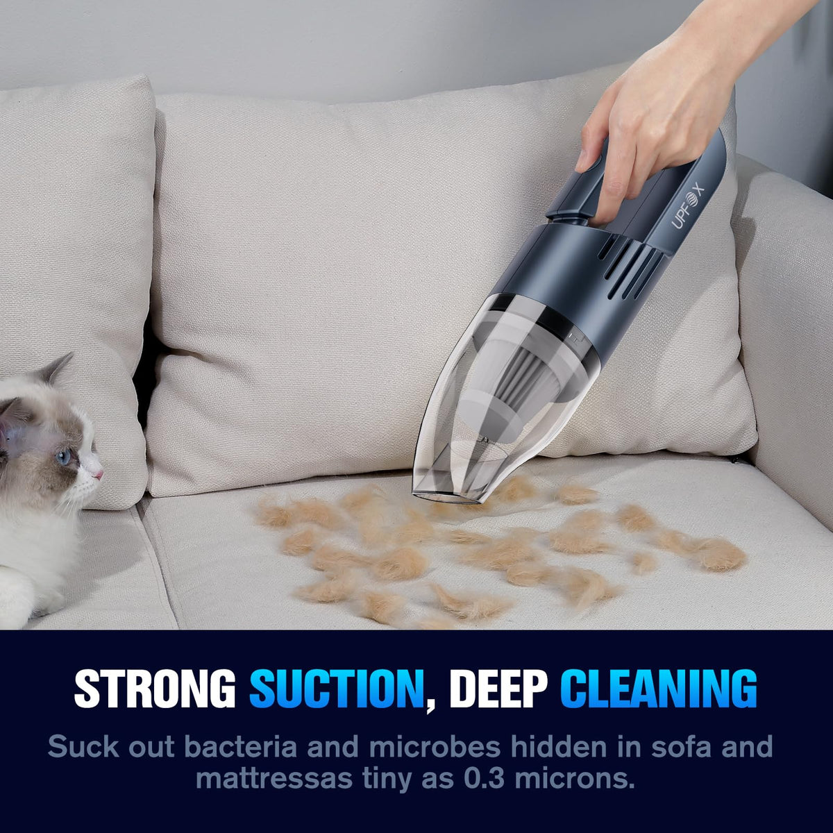 Q: Is the UPFOX Mini Vacuum Cleaner suitable for pet hair removal?A: Yes, the UPFOX Mini Vacuum Cleaner is designed with powerful suction that makes it highly effective for removing pet hair, dust, and debris from various surfaces such as car seats, carpets, and even hard-to-reach corners.