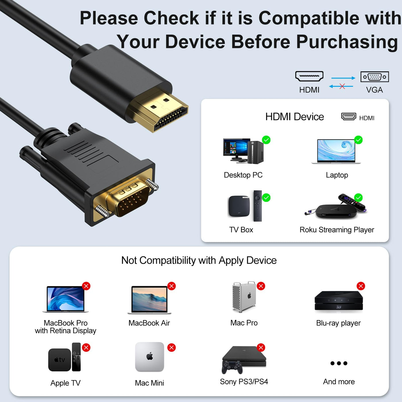 Q: What should I know about using this cable with low-power HDMI devices?A: The URELEGAN HDMI to VGA cable is not compatible with low-power HDMI devices such as the Sony PS5, MacBook Pro with Retina Display, Mac mini, and Apple TV. It is important to ensure your device's HDMI port meets the required power specifications for optimal performance.
