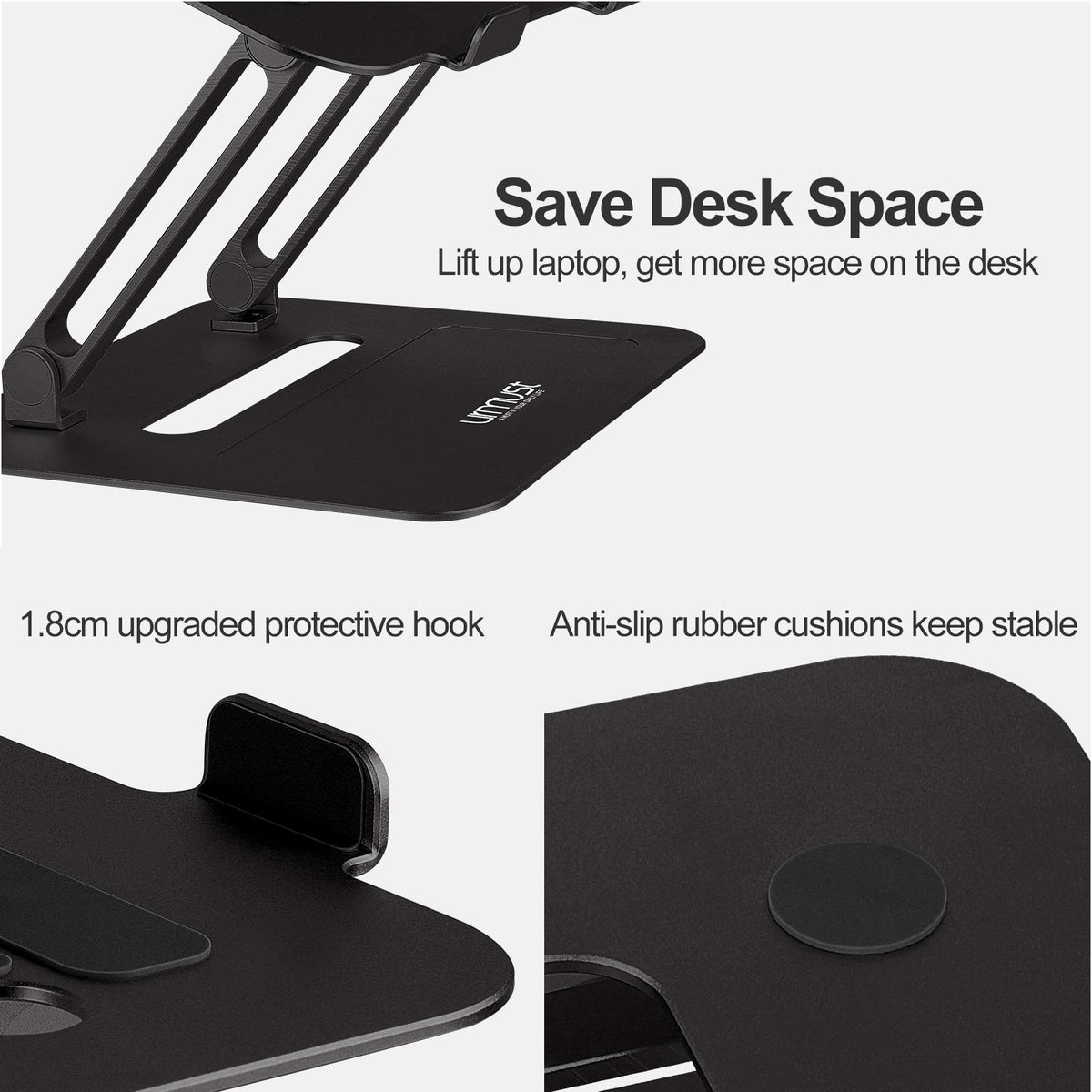 Urmust Adjustable Laptop Stand For Desk Aluminum Computer Stand For Laptop Riser Holder Portable Notebook Stand Compatible With Macbook Air Pro, Dell, Hp, Lenovo Samsung, Alienware All Laptops 11-17' ?Upgraded 1.8Cm Protective Hook Macbook Stand Upgraded 1.8Cm Protective Hook And The Anti-Slip Silicone Rubber Pads On The Top Prvent Your Laptop From Slipping And Scratched.The Anti-Skid Silicone Mat On The Bottom Keep The Laptop Stand In A Position And Not Move.