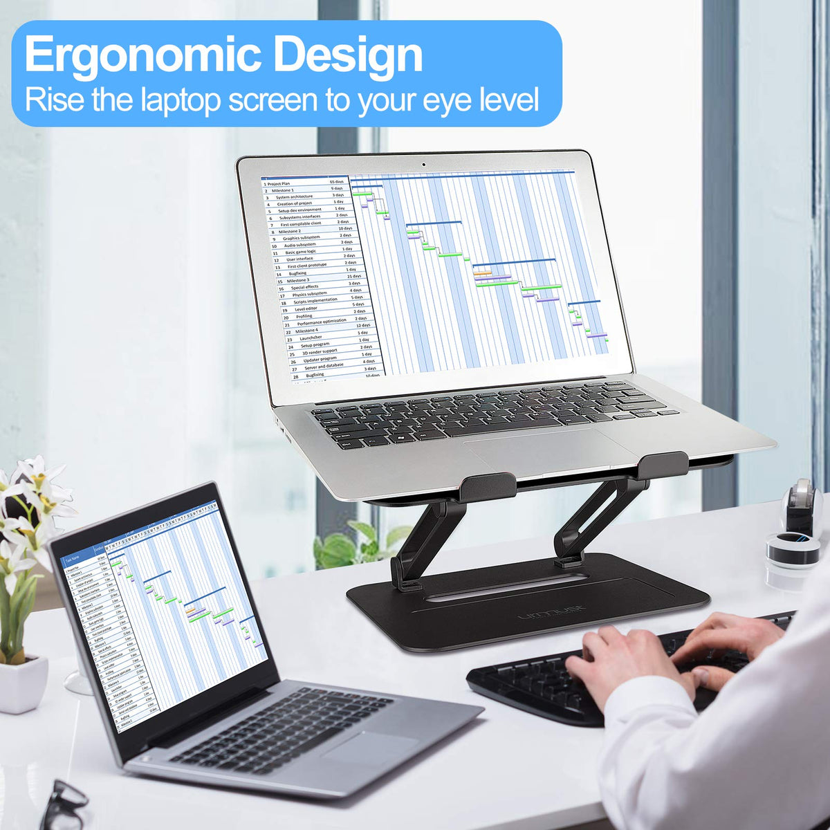 Q: How can the adjustable design of this laptop stand improve my posture?A: The adjustable design of the Urmust Laptop Stand allows you to raise your laptop screen to eye level, which helps to maintain proper posture while working. This feature is especially beneficial for reducing neck and shoulder pain, making it ideal for teachers and students who spend long hours on their laptops.