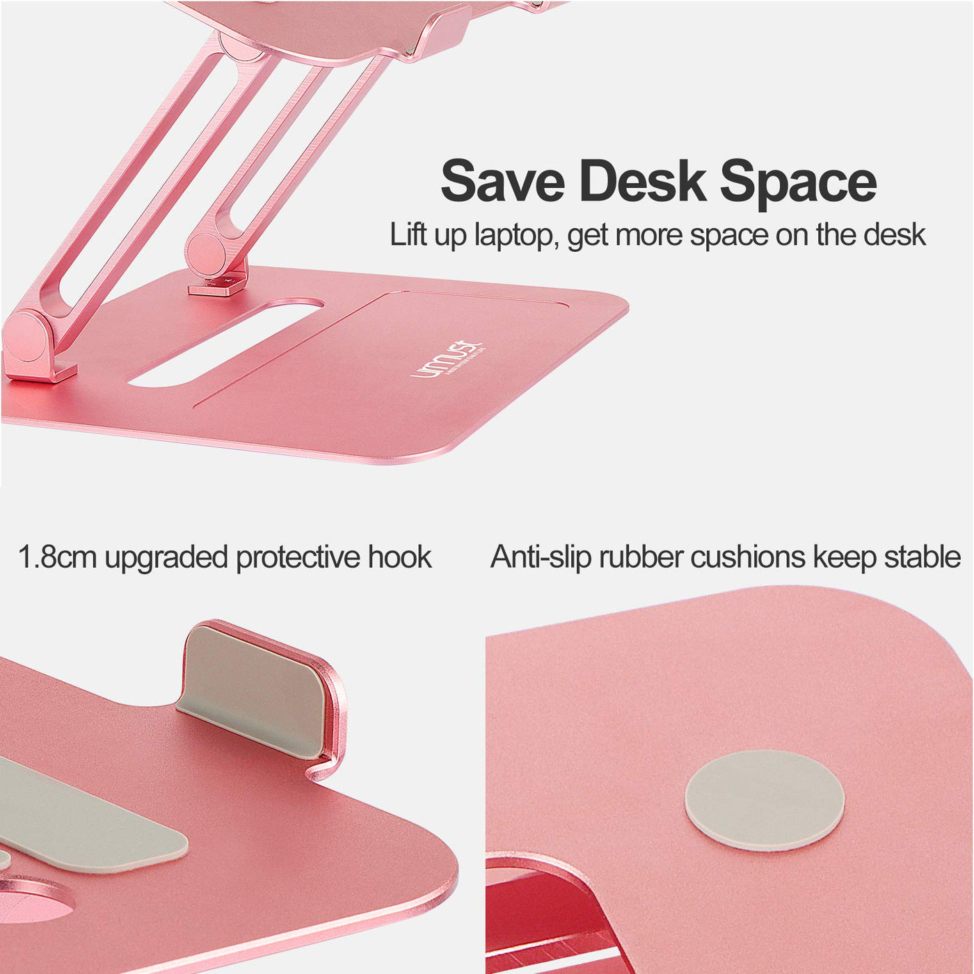 Urmust Adjustable Laptop Stand For Desk Aluminum Computer Stand For Laptop Riser Holder Portable Notebook Stand Compatible With Macbook Air Pro, Dell, Hp, Lenovo Samsung, Alienware All Laptops 11-17' ?Upgraded 1.8Cm Protective Hook Macbook Stand Upgraded 1.8Cm Protective Hook And The Anti-Slip Silicone Rubber Pads On The Top Prvent Your Laptop From Slipping And Scratched.The Anti-Skid Silicone Mat On The Bottom Keep The Laptop Stand In A Position And Not Move.
