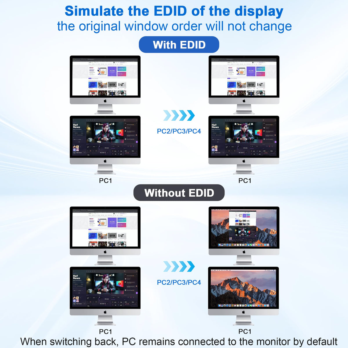 Usb 3.0 4 Ports 2 Monitor Kvm Switch 4K@60Hz For 4 Computer4 Port Usb 3.0 Dual-Monitor Hdmi Kvm Switch (Hdmi + Hdmi).&Nbsp;Product Features4 Computers/Laptops Share One Set Of Keyboard, Mouse And Dual Monitors, And More Usb 3.0 Peripherals;With Extra 3 Usb 3.0 And Audio Microphone Output;Support Maximum Resolution Up To 4K 60Hz Yuv 4:4:4, Hdcp 1.4, Hdr 2.2;With Edid Emulator;Dual Monitors Output Support Up To 4K@60Hz For Extended, Mirrored Or Spliced Display(Depends On Your Computer'S Graphics Card.);Advanced Switching Modes: Push Button And Wired Remote;Usb3.0 Dual Monitor Kvm Switch Can Simulate The Edid Of The Display, When The Monitor Is Switched Between 4 Computers, The Original Window Order Will Not Change.Installation Steps:1. Insert The Dc/5V Adapter Into The Kvm ;2. Plug The Hdmi Cable Into The Kvm And Monitor;(Output)3. Plug The Hdmi Cable And Usb Cable Into The Kvm And Your Computer/Laptop (Hdmi Cables Are Not Included)(Input)Hdm1 In1 A + Hdm1In1 B + Usb In1=Pc1Hdm1 In2 A + Hdm1In2 B + Usb In2=Pc2Hdm1 In3 A + Hdm1In3 B + Usb In2=Pc3Hdm1 In4 A + Hdm1In4 B + Usb In2=Pc44. Insert The Mouse And Keyboard Into The Kvm Switch5. If Needed, You Can Connect A Microphone And Audio Portnote:1. Most Of The Reasons Why Only Onevideo Output Works Is Because Of Incorrect Connection. Please Make Sure Eachcomputer Have 2 Hdmi Cables Connect To The Kvm.2. If The Kvm Switch Does Not Work, You Can Turn Off The Switch On The Panel And Turn It On Again After 2-3 Seconds, And It Will Return To Normal.3.Please Check The Hdmi In A1 &Amp; A2 &Amp; A3 &Amp; A4, Hdmi In B1 &Amp; B2 &Amp; B3 &Amp; B4 And Usb In1 &Amp; In2 &Amp; In3 &Amp; In4 Is Corresponding, Hdmi Out A, Hdmi Out B Is Corresponding, Not Support Mixed Insertion.4.Note: Hdmi Cables Are Not Includedusb 3.0 Dual Monitor Kvm Support 4K@60Hz