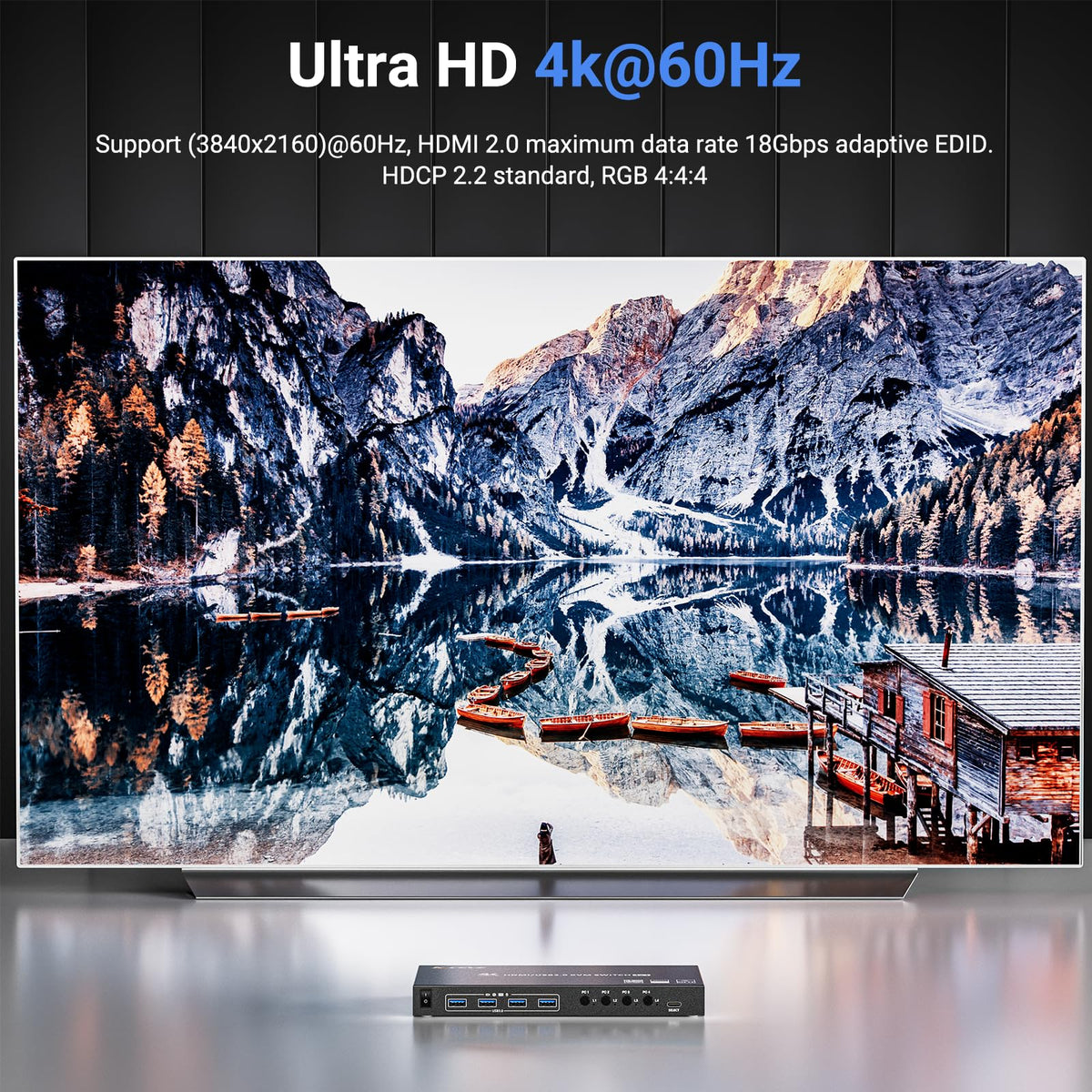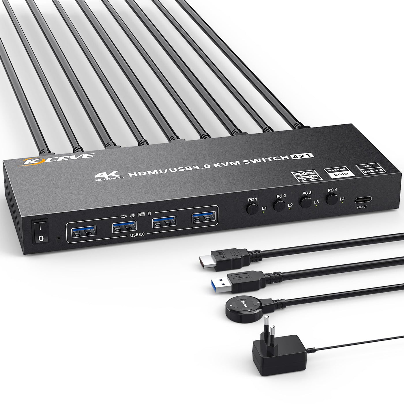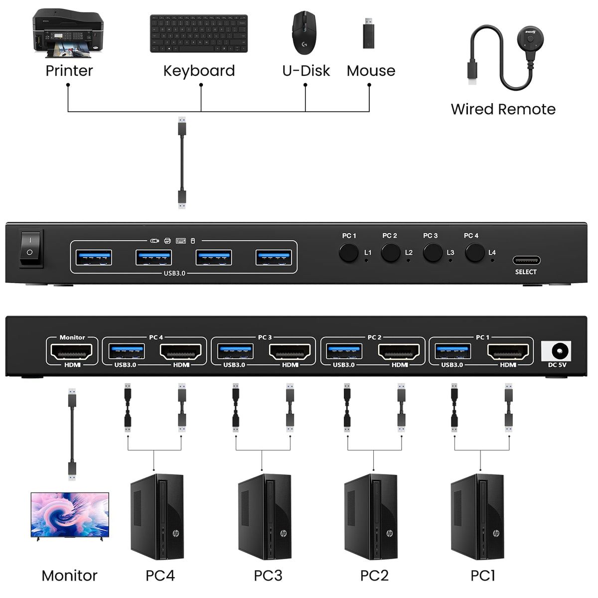 ?Hdmi Kvm Switch 4 Pc 1 Monitor?This Hdmi Kvm Switch With 4 Hdmi2.0 Ports, 4 Usb3.0 Ports, Just A Set Of Usb Keyboard And Mouse, You Can Control 4 Computers At The Same Time, One Monitor To Share, Easy To Switch Between 4 Computers, Can Be Widely Used In Education, Conference Training, Audio-Visual Entertainment And Other Fields. | ?Ultra Hd 4K@60Hz?This Hdmi Kvm Switch Supports Resolutions Up To 4K@60Hz (3840 X 2160) And Rgb 4:4:4 And Is Backwards Compatible With Other Lower Resolutions. The Ultra-High Definition Video Image Shows Every Detail, Brings Images And Colors To Life, And Provides The Best Visual Enjoyment For Your Office And Entertainment Needs (Important: Make Sure Your Computer And Monitor Support 4K Resolution And Use Hdmi 2.0 Cable) . | ?Kvm Switch 4 Pc 1 Monitors With 4 Usb3.0 Ports?This Kvm Switch With 4 Usb3.0 Ports Can Share Keyboard, Mouse, U Disk, Printer, Network Camera And Other Usb Port Devices. The Usb3.0 Port Supports Data Transfers Up To 5Gbps And Is Backwards Compatible With Usb 2.0 And Usb 1.1 Devices. | ?Kvm Switch Support Edid Emulation?Support Edid Display, You Can Emulate The Edid Of The Monitor And Save The Resolution And Refresh Rate Of The Monitor. After Switching, The Window Position Of The Original Source Display Information Remains Unchanged. It Also Supports Hdmi 2.0 With A Transfer Rate Of 5Gbps And Hdcp 2.2 Decryption, Giving You A Great Office Experience. | ?Wide Compatibility & Easy Control?Plug And Play, All Computers And Other Devices With Hdmi Ports Are Perfectly Compatible. Supports Ps4, Xbox, Hdtv And Other Popular Devices, Compatible With Windows 10.7.2000.Xp.Vista, Linux, Unix, Ubuntu, Fedora And Other Mainstream Operating Systems. One-Touch Control Of The Switcher Is Supported So You Can Turn It On Or Off. You Can Also Switch Computers Using The Control Panel Switch And Desktop Controller (Included). Switching Only Takes 3-5 Seconds And Is | ?Package Included?1*Usb 3.0 Kvm Switch, 4*Usb 3.0 Cables A To A (*1.5M). 1*Hdmi2.0 Cable(1.5M), 1*Wired Remote Control, 1*User Manual.1*Power Cable