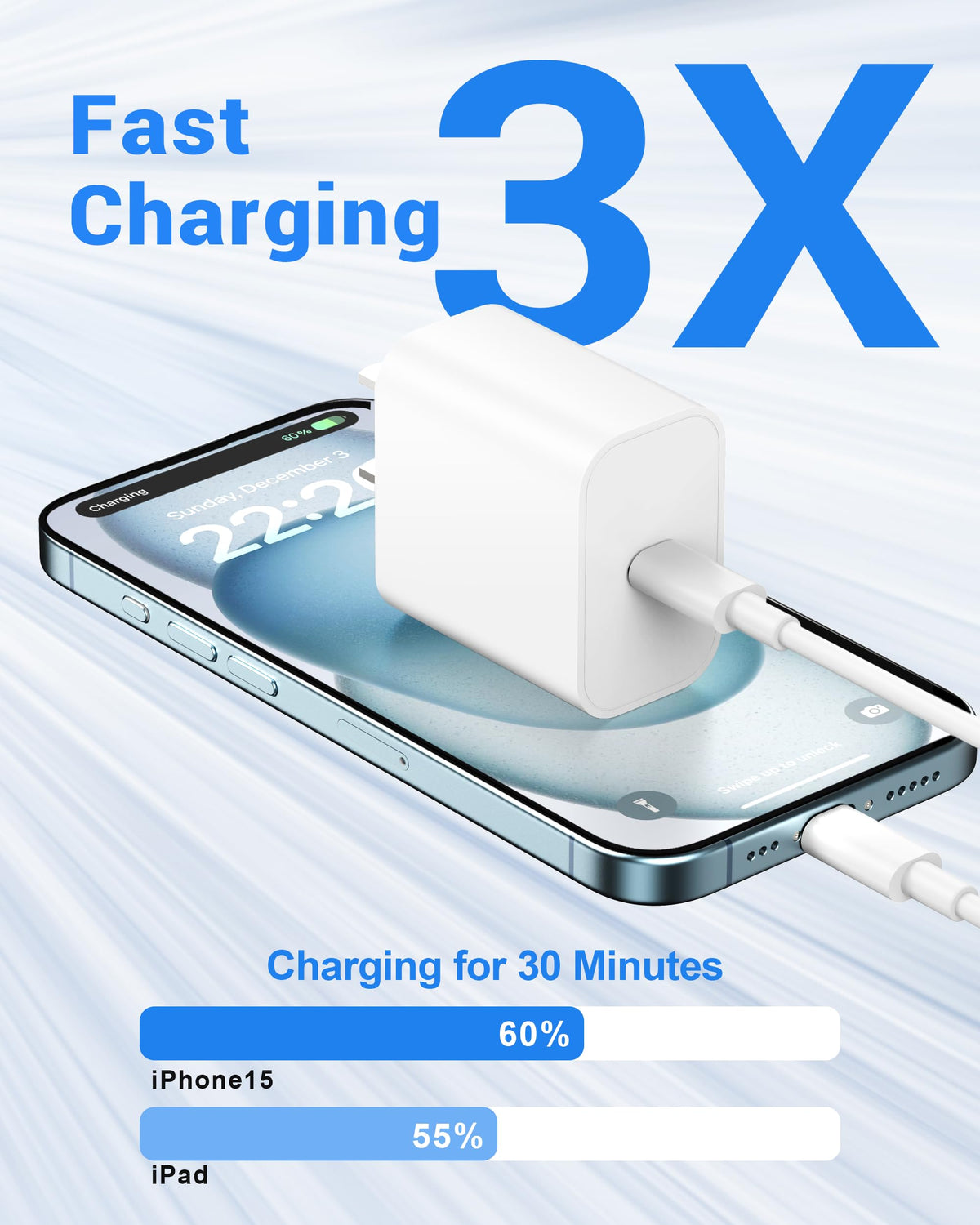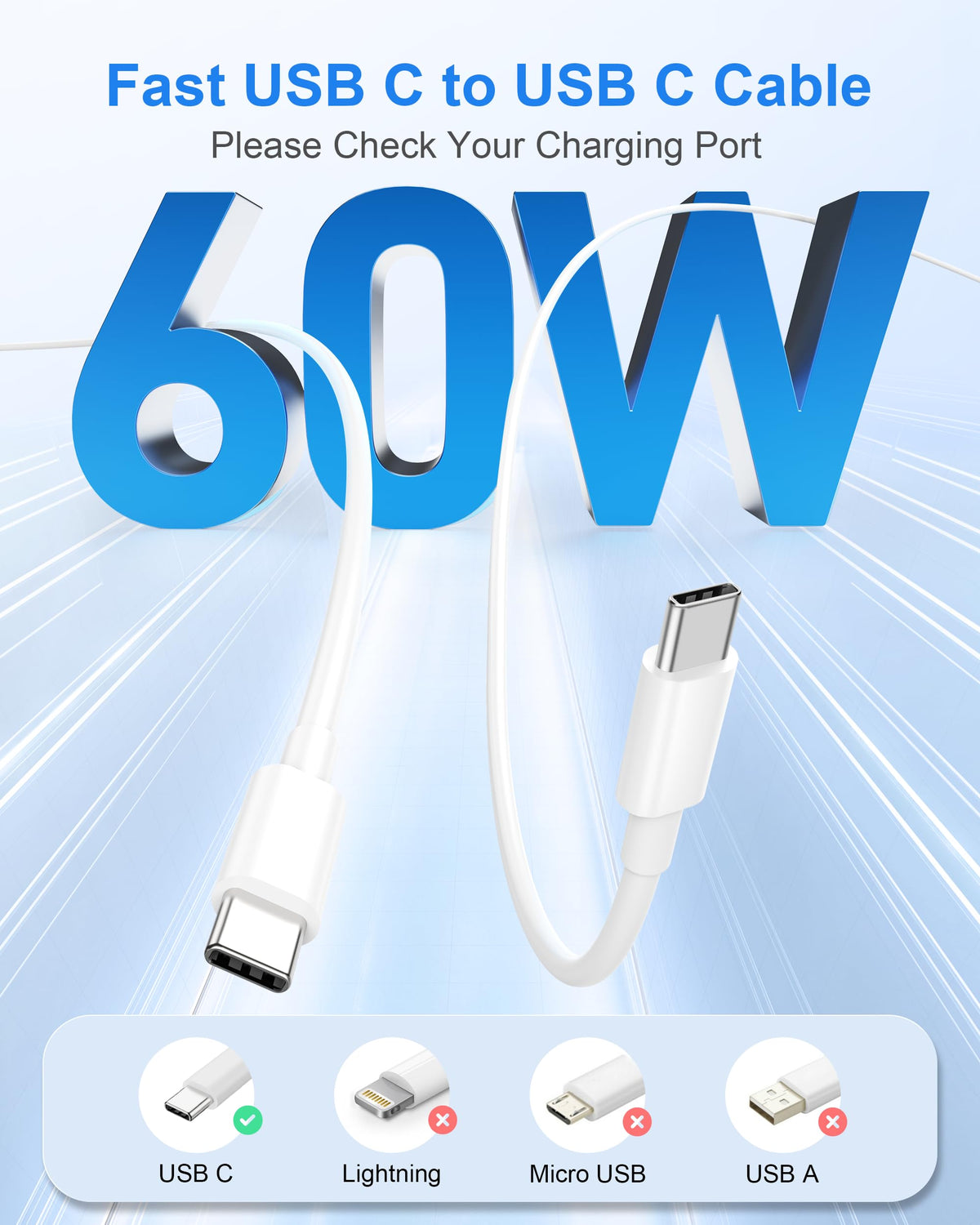 Usb C Fast Charger 6Ft For Iphone 15, Iphone 15 Pro, Iphone 15 Pro Max, Iphone 15 Plus, Ipad Pro 12.9 Inch 6Th/5Th/4Th/3Rd (2022/2021/2020/2018), Ipad Pro 13 Inch 2024, Ipad Pro 11 Inch 4Th/3Rd/2Nd/1St (2024/2022/2021/2020/2018), Ipad Air 6Th/5Th/4Th (2024, 2022, 2020), Ipad Mini 6 (2021), Ipad 10Th (2022) And More Usb C Devices Fast Charging And Data Transfer Cable The Usb-C To Usb-C Cord Support Pd Fast Charger And Data Transmission Simultaneously, Transfer Speed Max Up To 480Mbps, And Charging Speed Max Up To 60W (20V/3A), Stable And Efficient, Improve The Rate And Save Your Time. 6-Foot Long Length Provide More Charging Space For You, So You Can Convenient To Charge Your Device In Bedroom, Sofa, Office. 20W Usb-C Fast Charging Block Built-In Advanced Usb Pd Power Delivery 3.0 Chip, And Loaded With 20W Output Power. The Usb C Wall Charger Can Intelligent Recognition Of Your Device'S Maximum Charging Speed, Full Charge Your Ipad Pro 12.9 In About 2.5 Hours, Save You More Time. Compatible Devices Iphone 15,Iphone 15 Pro, Iphne 15 Pro Max, Iphone 15 Plus Ipad Pro 12.9 Inch (2022, 6Th Generation) Ipad Pro 12.9 Inch (2021, 5Th Generation) Ipad Pro 12.9 Inch (2020, 4Th Generation) Ipad Pro 12.9 Inch (2018, 3Rd Generation) Ipad Pro 11 Inch (2022, 4Th Generation) Ipad Pro 11 Inch (2021, 3Rd Generation) Ipad Pro 11 Inch (2020, 2Nd Generation)1 Ipad Pro 11 Inch (2018, 1St Generation) Ipad Air 10.9 Inch (2022, 5Th Generation) Ipad Air 10.9 Inch (2020, 4Th Generation) Ipad Mini 6Th 8.3 Inch (2021, Generation) Ipad 10Th 10.9 Inch (2022, Generation) Google Pixel 7 / 6 / 5 / 4 / 3 / 2 / 1 / Series And More Usb C Devices