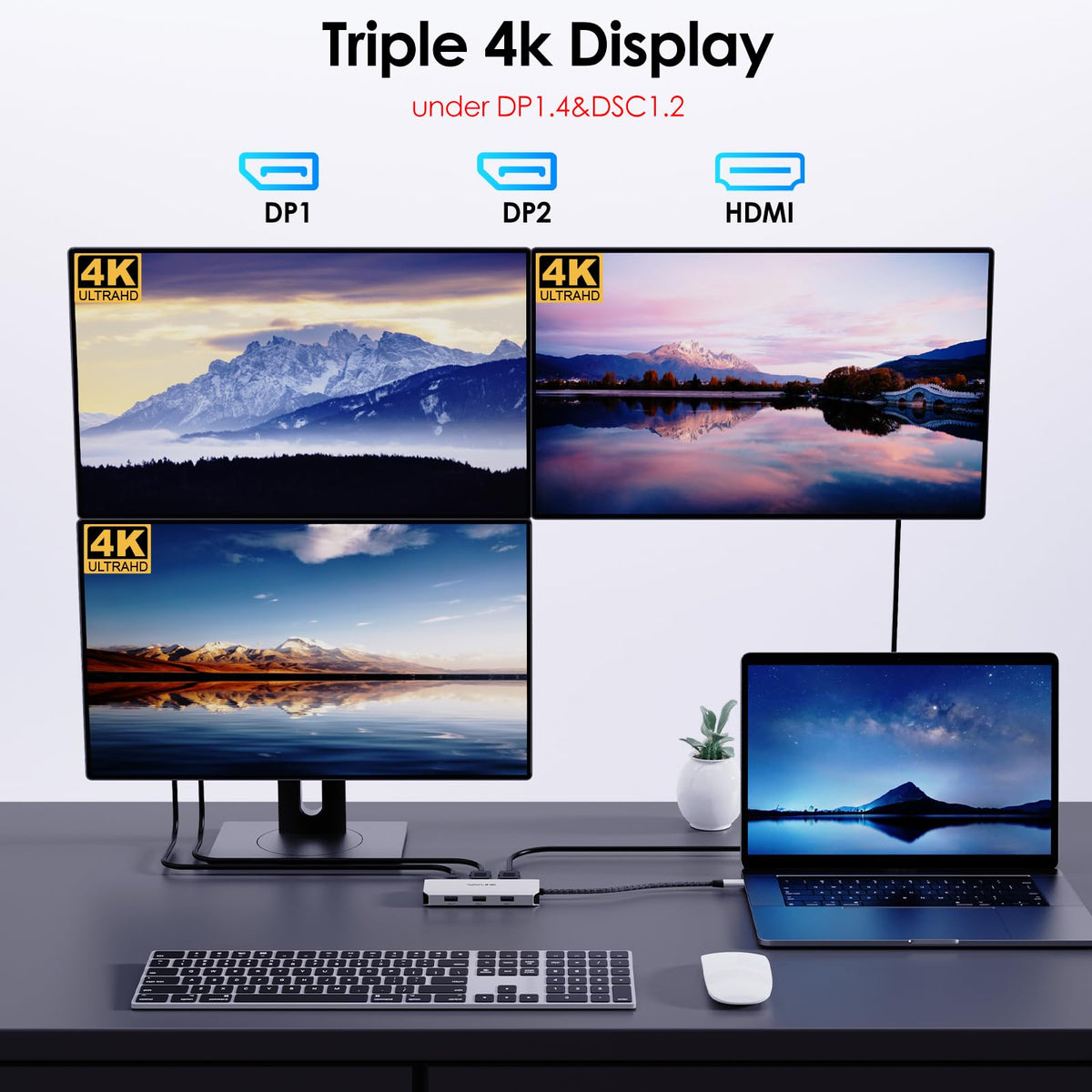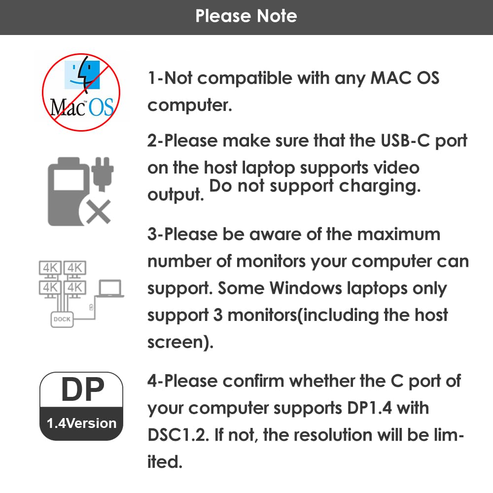 Important Notes - Not Compatible With Any Mac Os Computer. Do Not Support Charging. This Docking Station For Windows Computer Only. The Type-C Port Of Your Host Should Support Video Output, If Not , You Can Not Use It. Some Windows Laptops Only Support 3 Monitors(Including The Host Screen) Due To Their Graphic Card Limitations. Please Be Aware Of The Maximum Number Of Monitors Your Computer Can Support. Please Confirm Whether The C Port Of Your Computer Supports Dp1.4 With Dsc1.2. If Not, The Resolution Will Be Limited. If You Have Any Questions Or Encounter Difficulties Please Feel Free To Ask Us